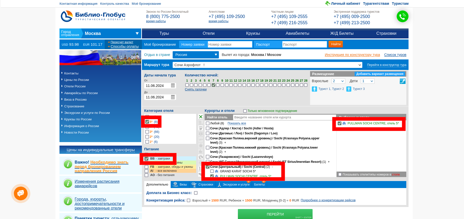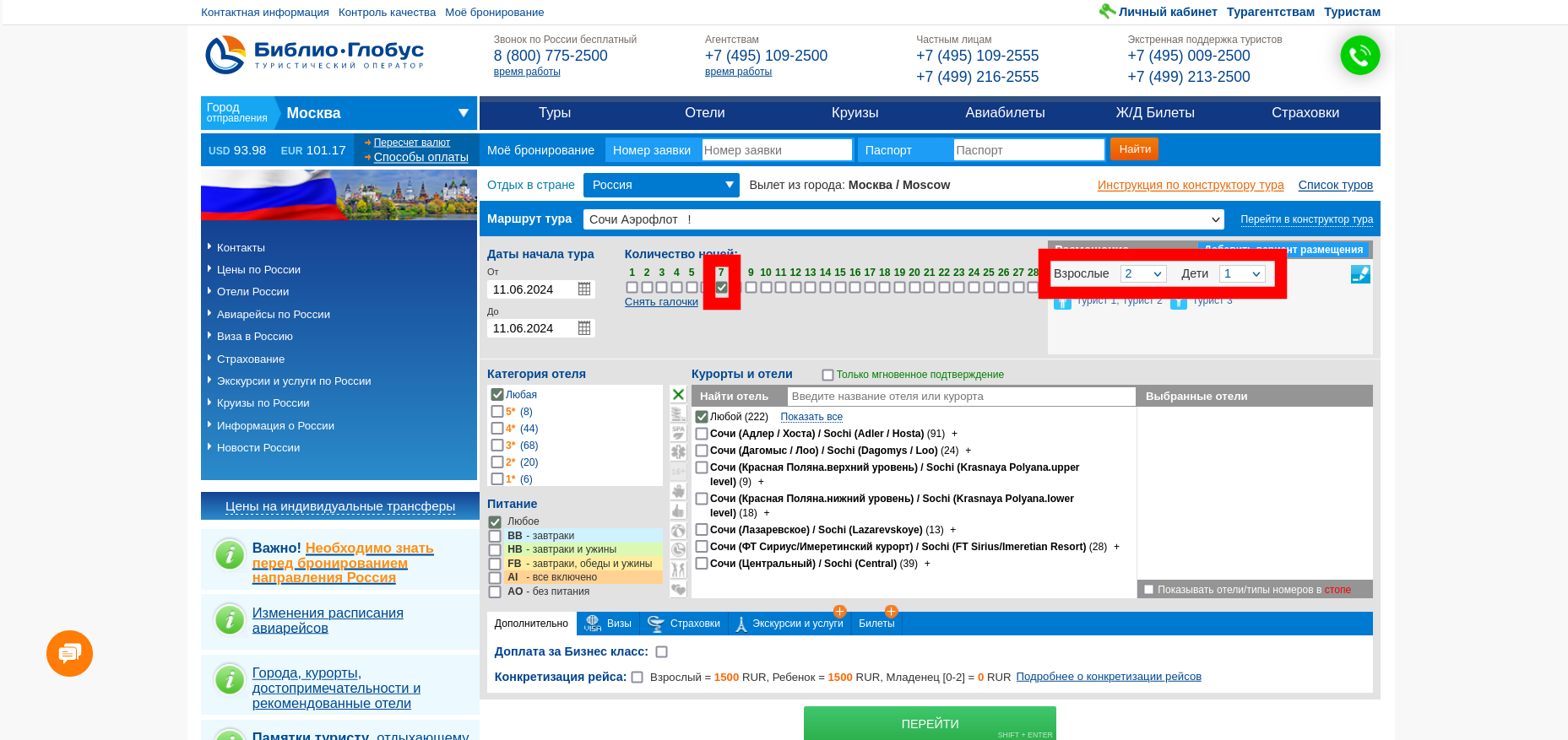 6. На странице поиска тура выберите нужное количество ночей, количество взрослых и детей в туре.