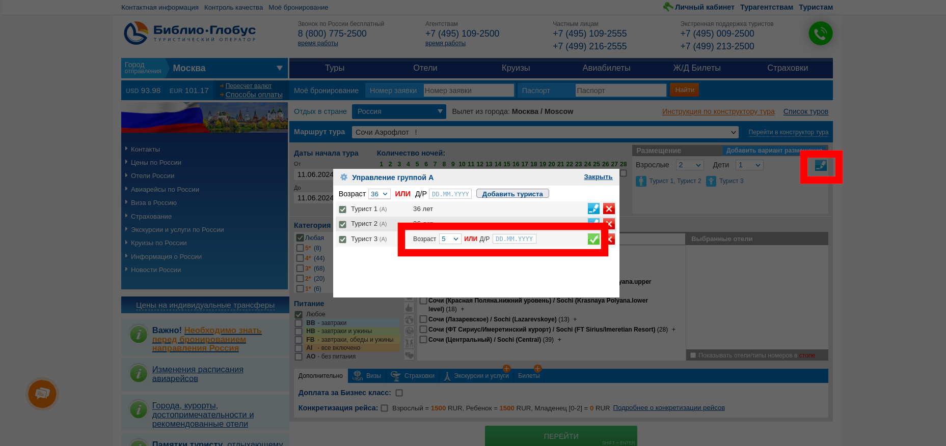 7. Укажите точный возраст детей в дату начала тура, нажав на кнопку с изображением карандаша.
