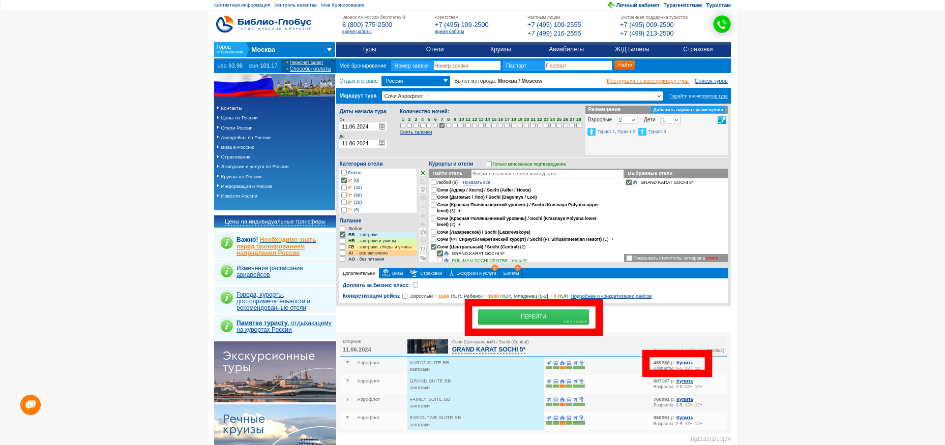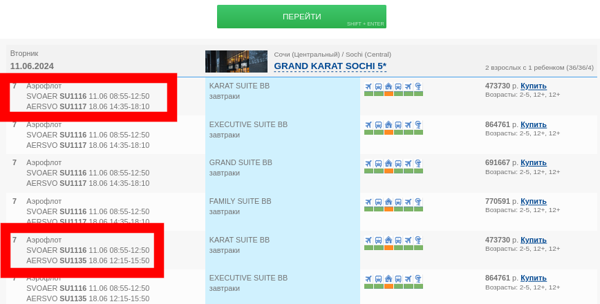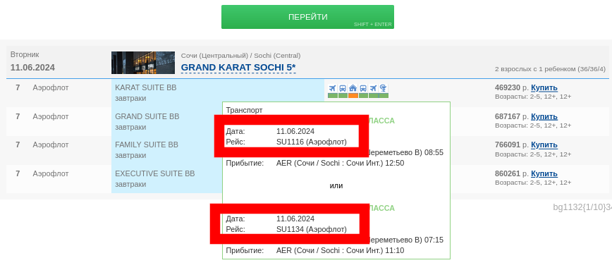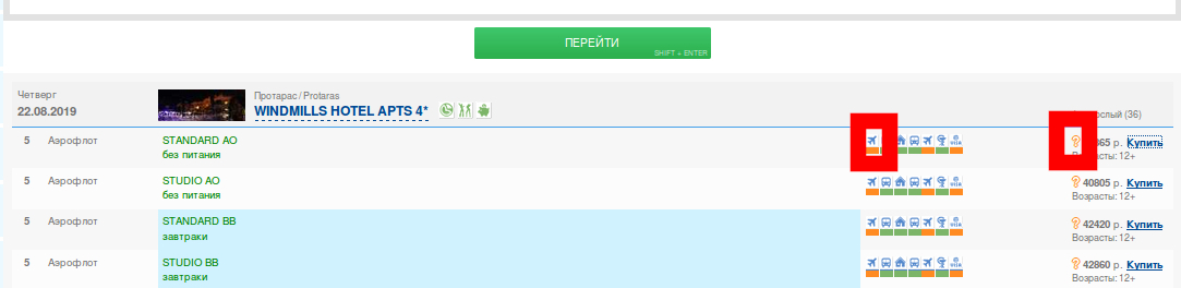10. Далее нажимаете кнопку "Перейти", выбираете подходящий вариант размещения и стоимость, нажимаете ссылку "Купить" (справа от стоимости тура).