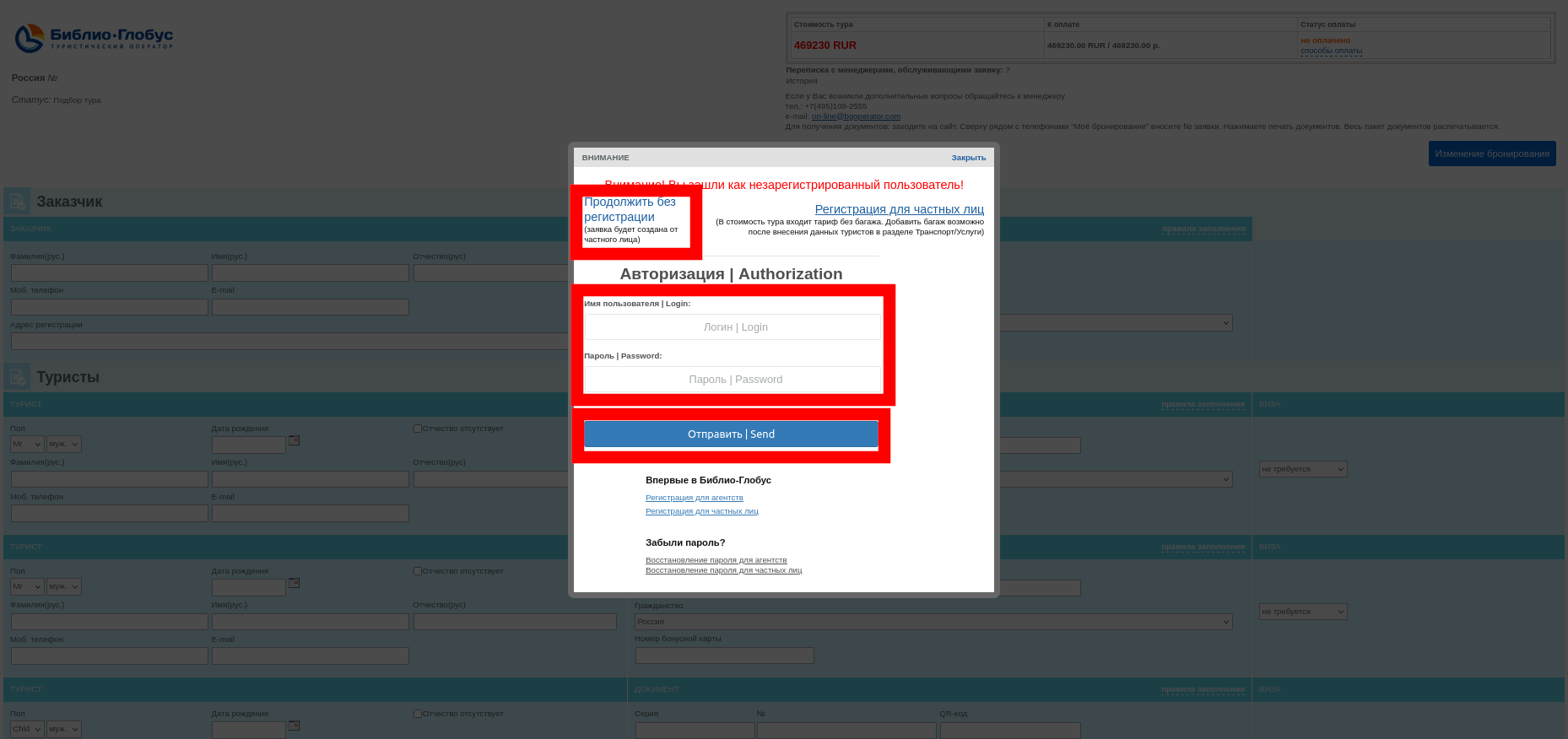 11. Система предложит Вам варианты бронирования с регистрацией (если Вы ранее регистрировались на сайте, то необходимо ввести логин и пароль, далее отправить) или продолжить без регистрации. Далее, после внесения авансового платежа (полной оплаты), будет проведена автоматическая регистрация и Вам на e-mail придет логин-пароль.