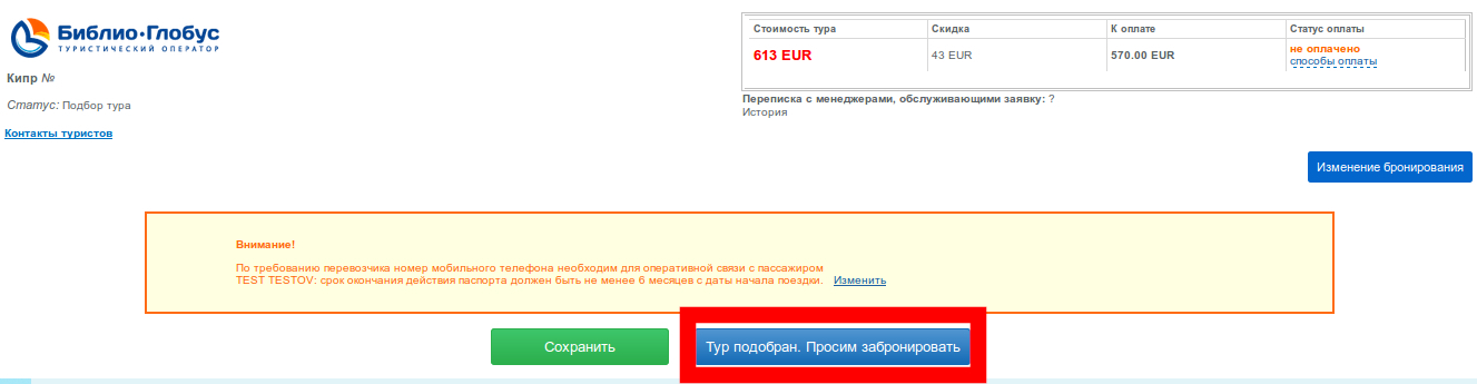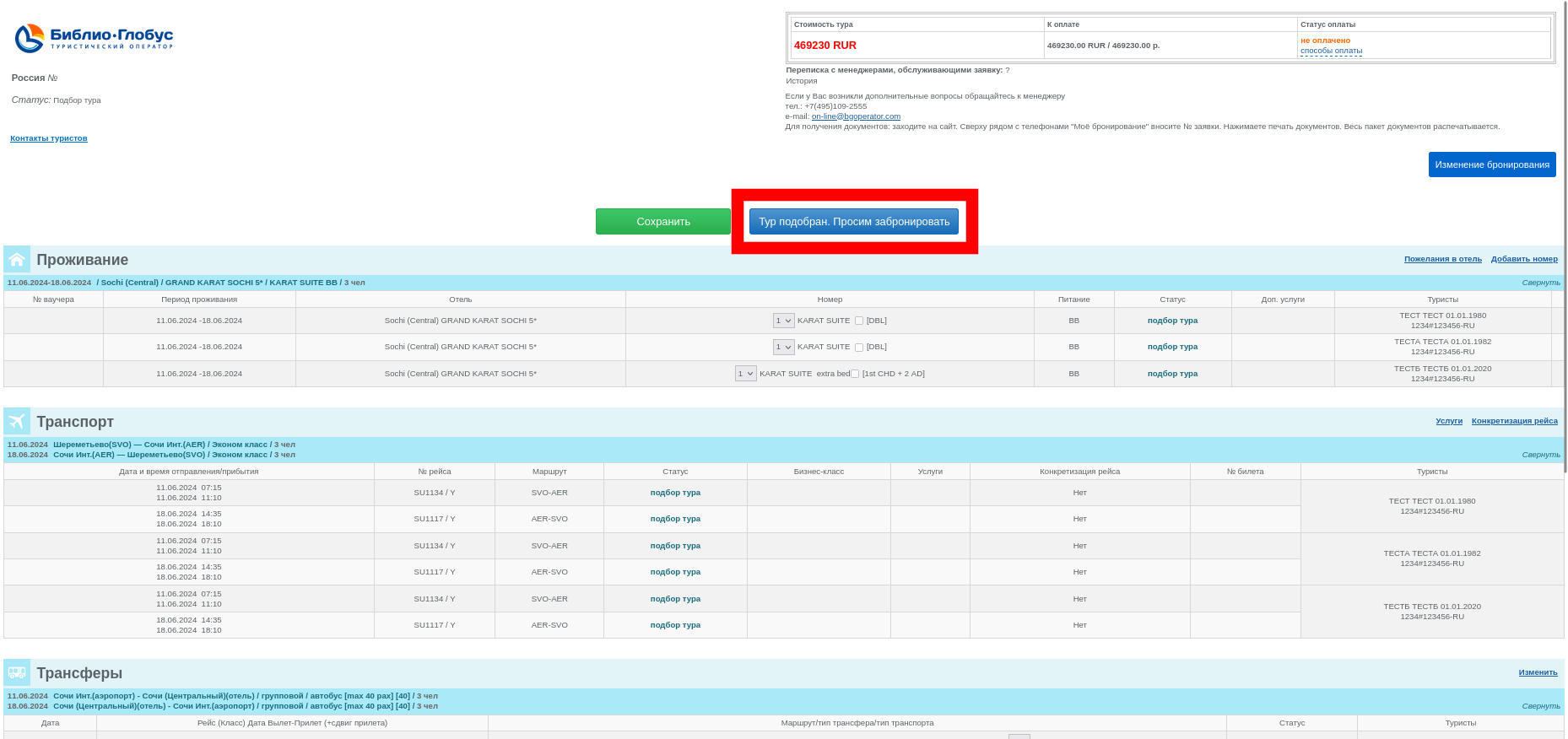 14. Далее нажимаете кнопку "Тур подобран. Просим забронировать".