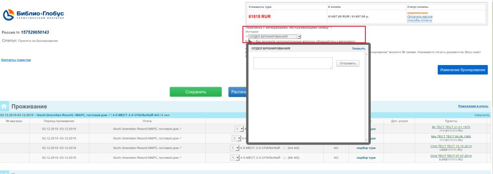 Все запросы на изменении поездки, уточняющие вопросы к менеджеру Вам следует писать непосредственно в своей заявке в виде комментария в "Отдел Бронирования". Эта функция доступна сразу же после присвоения заявке номера.