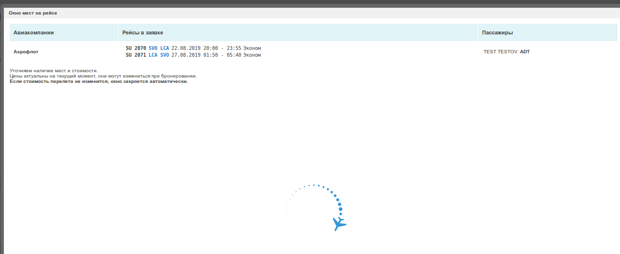 После внесения данных туристов и нажатия на кнопку "Сохранить" система бронирования начнет обновление тарифов по выбранному направлению, и покажет следующую страницу: