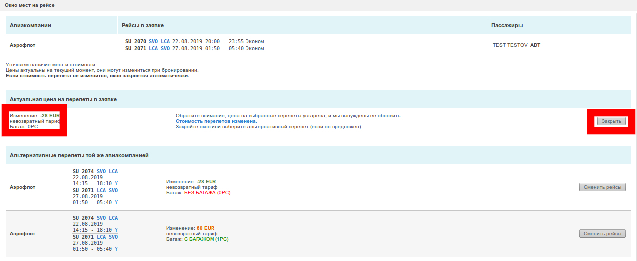 В данном примере заявка стала дешевле на 28 EUR при бронировании тарифа без багажа (0PC). Если данный вариант устраивает, то необходимо нажать на кнопку "Закрыть". Если клиентам требуются другие рейсы или другой тариф, то необходимо найти в списке нужную комбинацию рейсов и тарифов и нажимать кнопку "Сменить рейсы" именно в выбранной подходящей для прелетеа строчке.