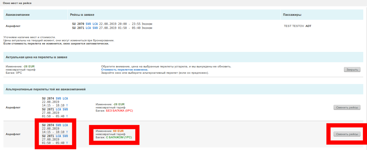 После завершения обновления цен отобразится информация о наличии багажа и изменении цен по рейсам в заявке. А также будут предложены другие варианты тарифов на этих рейсах, другие рейсы с разными вариантами тарифов.
