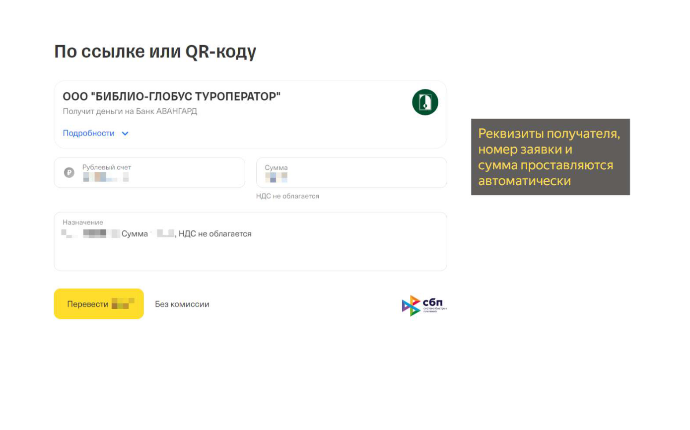 Для российских туров и туров в Абхазию сумма будет равна рекомендованной к оплате. Для зарубежных туров сумма будет рассчитана по курсу, размещенному на сайте www.bgoperator.ru. на дату формирования QR-кода/ссылки, умноженной на сумму у.е., рекомендованную к оплате.