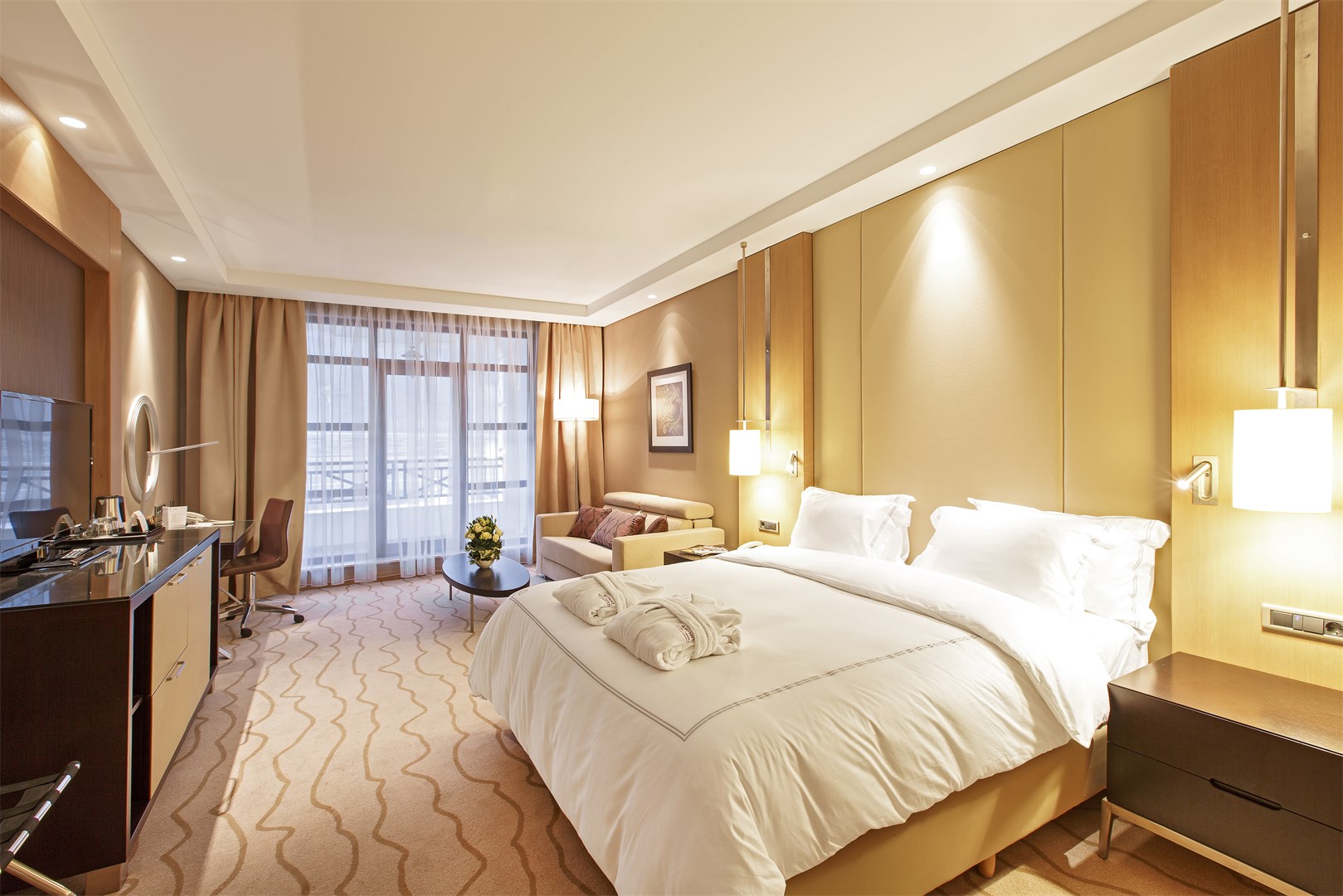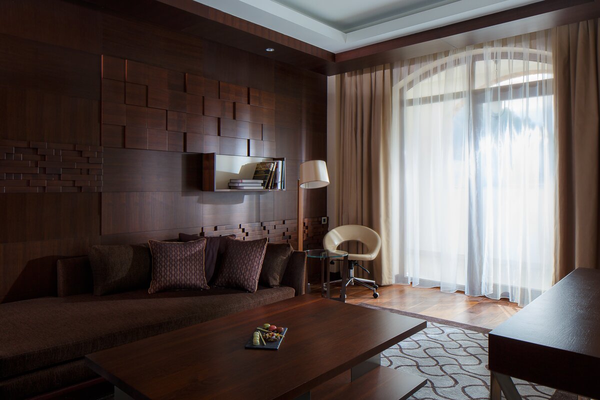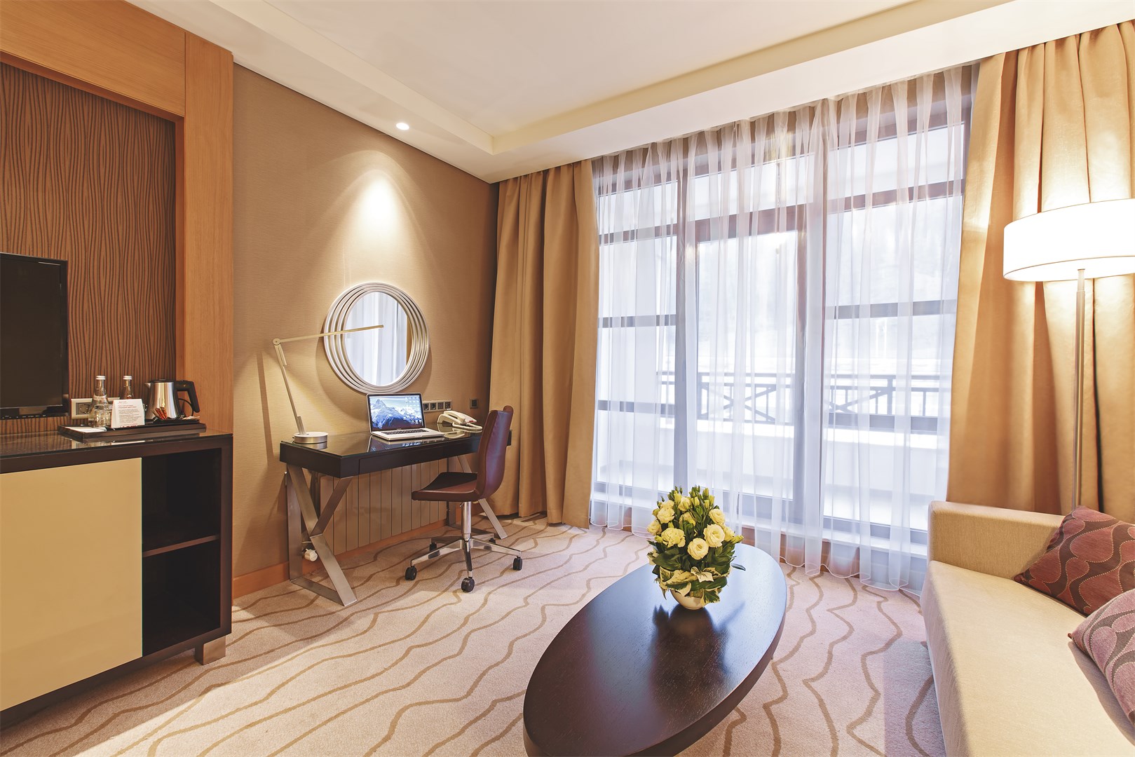 Элегантный 2-комнатный номер с двуспальной кроватью. В номере: балкон с видом на горы, гостиная комната с диваном и обеденной зоной. Номер оснащен организованным пространством для работы с письменным столом, телефоном. Спальная зона укомплектована премиальным постельным бельем. Санузел с ванной, душем, биде укомплектован феном, халатами, тапочками и бесплатными туалетно-косметическими принадлежностями брендовых итальянских марок