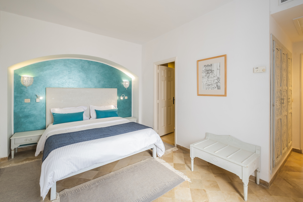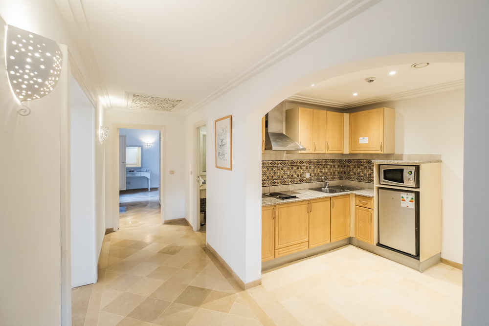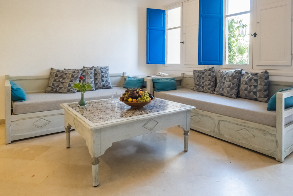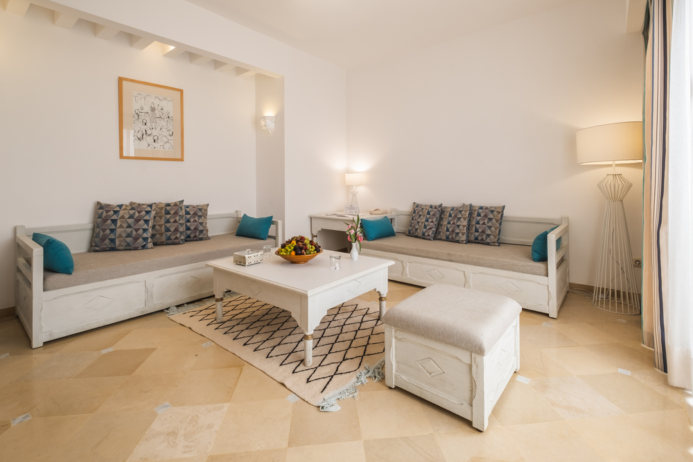 JUNIOR SUITE Вид из номера: на территорию отеля Площадь номера: 35 кв.м Комментарии: расположены в корпусах Erriadh и El Bousten 1 спальня с двуспальной кроватью, отдельная гостиная с двумя софами, межкомнатная дверь, оборудованная мини-кухня