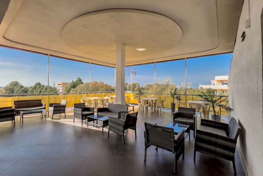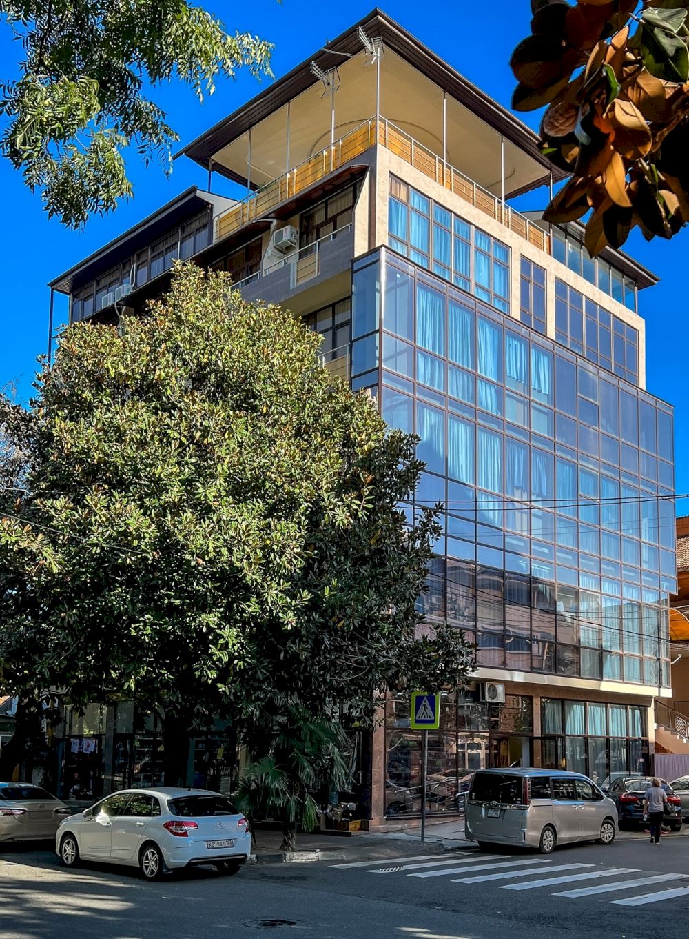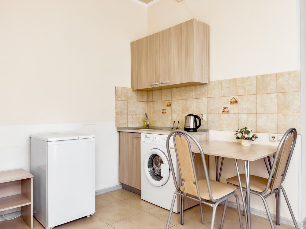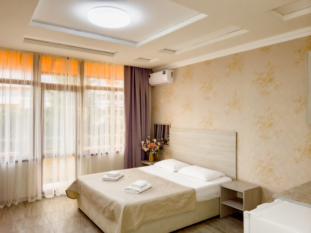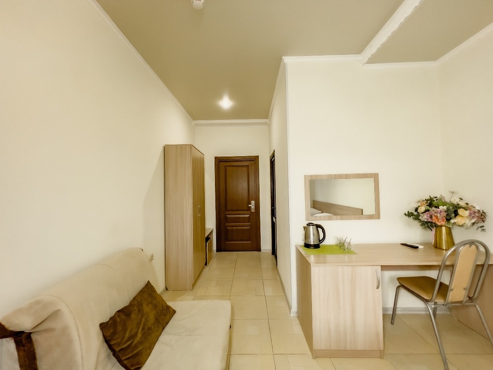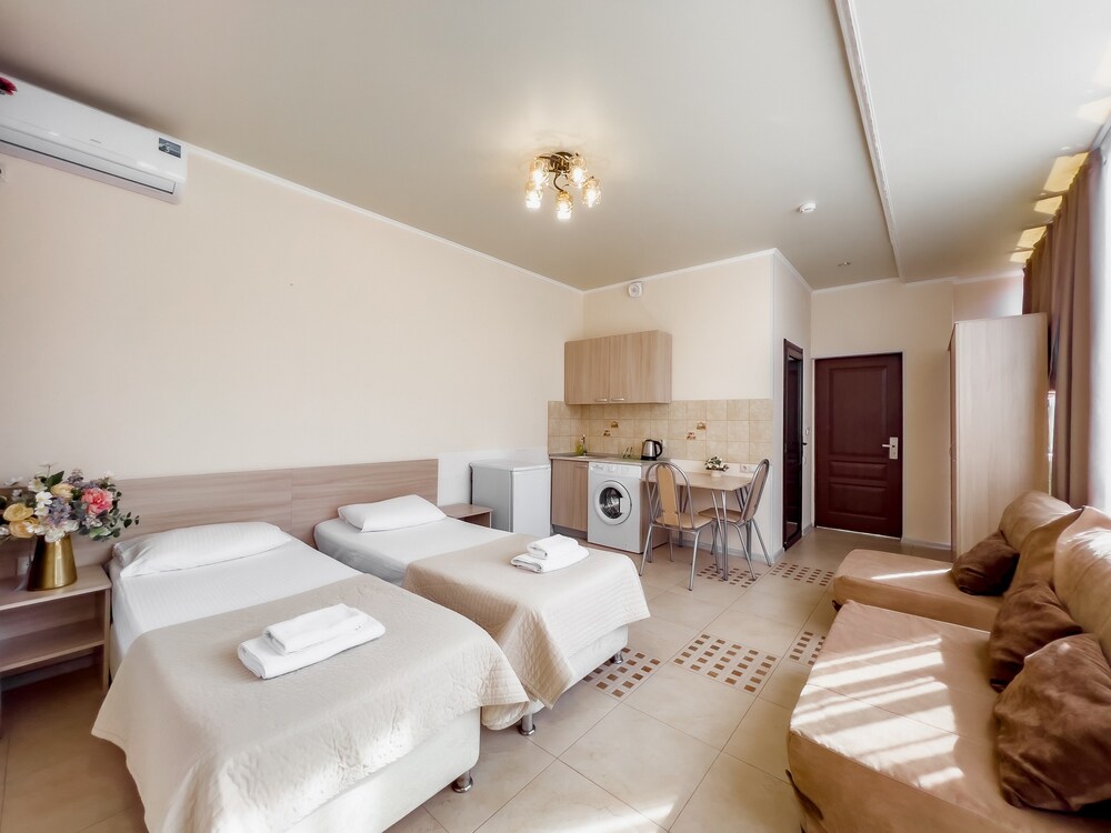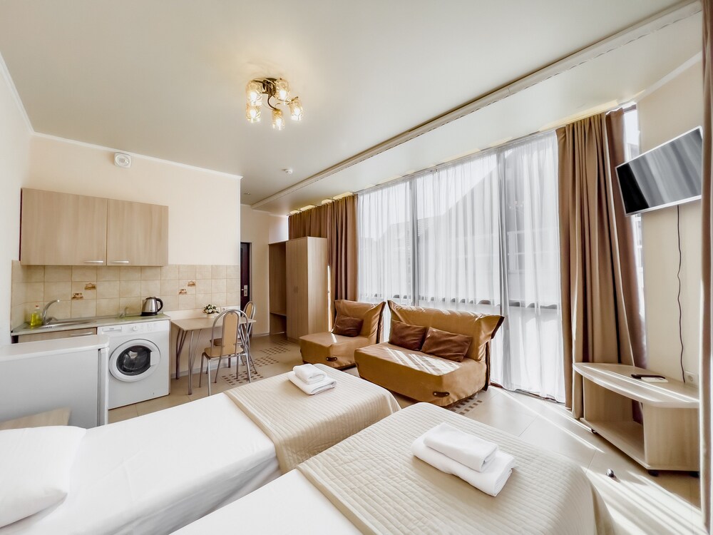 STUDIO 20 кв.м. 1-комнатный номер оформлен в классическом стиле рассчитан до 4 гостей. В номере имеется все необходимое, включая удобную мебель, двуспальную кровать и диван-кровать, стол обеденный, стулья, кондиционер, телевизор, холодильник, Wi-Fi, фен, полотенца, набор посуды, косметические принадлежности, тапочки, чайник, микроволновая печь, стиральная машинка, мультиварка, некоторые номера оборудованы балконом. Собственная ванная комната. Вид на город/ горы. Расположение номеров: 3-5 этаж