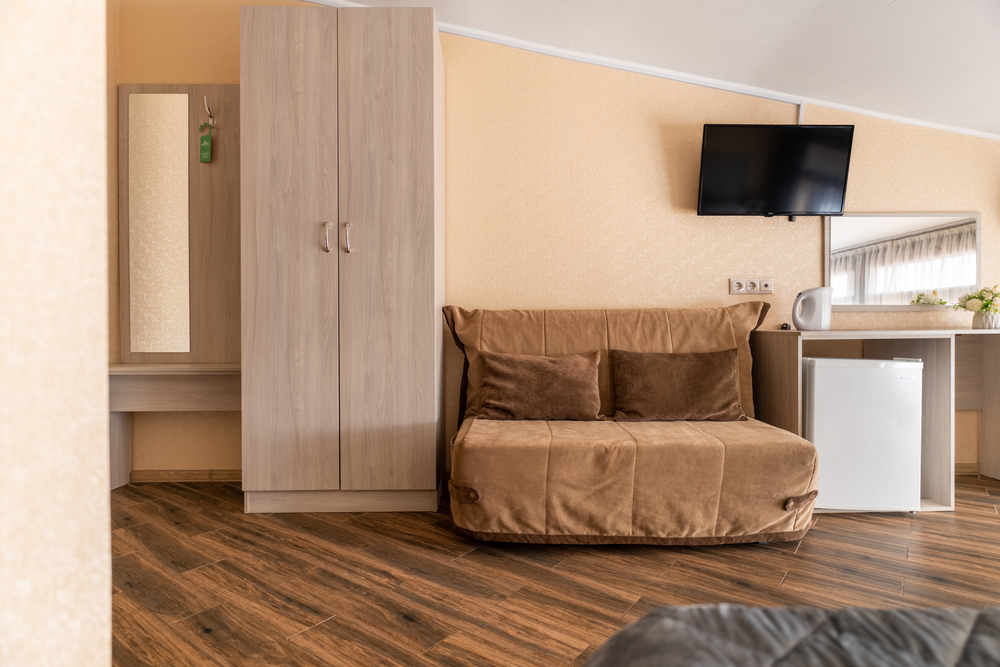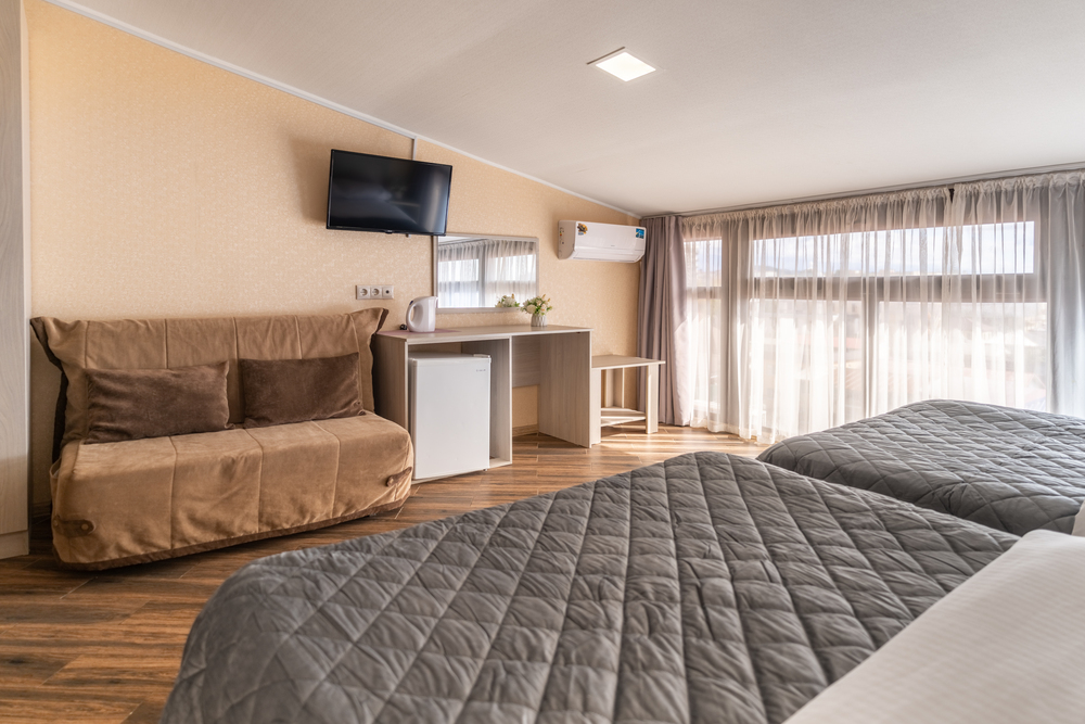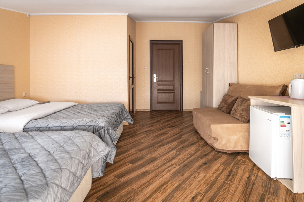 6-МЕСТН. SUPERIOR 22 кв.м. 1-комнатный номер оформлен в классическом стиле рассчитан до 6 гостей. Номер расположен на 6 этаже. В номере имеется все необходимое, включая удобную мебель, две двуспальные кровати и диван-кровать, кондиционер, телевизор, холодильник, Wi-Fi, фен, полотенца, косметические принадлежности, тапочки, набор посуды, чайник, стол обеденный, стулья. Номер оборудован ванной комнатой