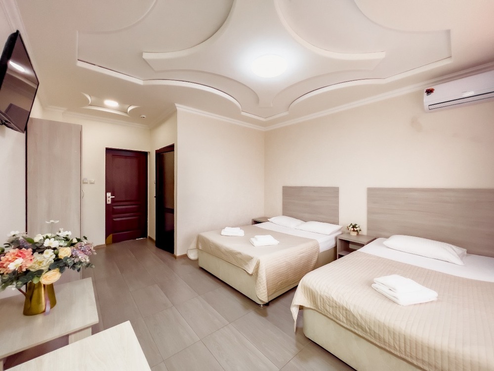 3-МЕСТН. COMFORT 15 кв.м. 1-комнатный номер оформлен в классическом стиле рассчитан до 3 гостей. В номере имеется все необходимое, включая удобную мебель, двуспальную кровать и односпальную/ двуспальную кровать и кресло-кровать, кондиционер, телевизор, холодильник, Wi-Fi, фен, полотенца, набор посуды. Собственная ванная комната. Вид на город/ горы. Расположение номеров: 3-6 этаж
