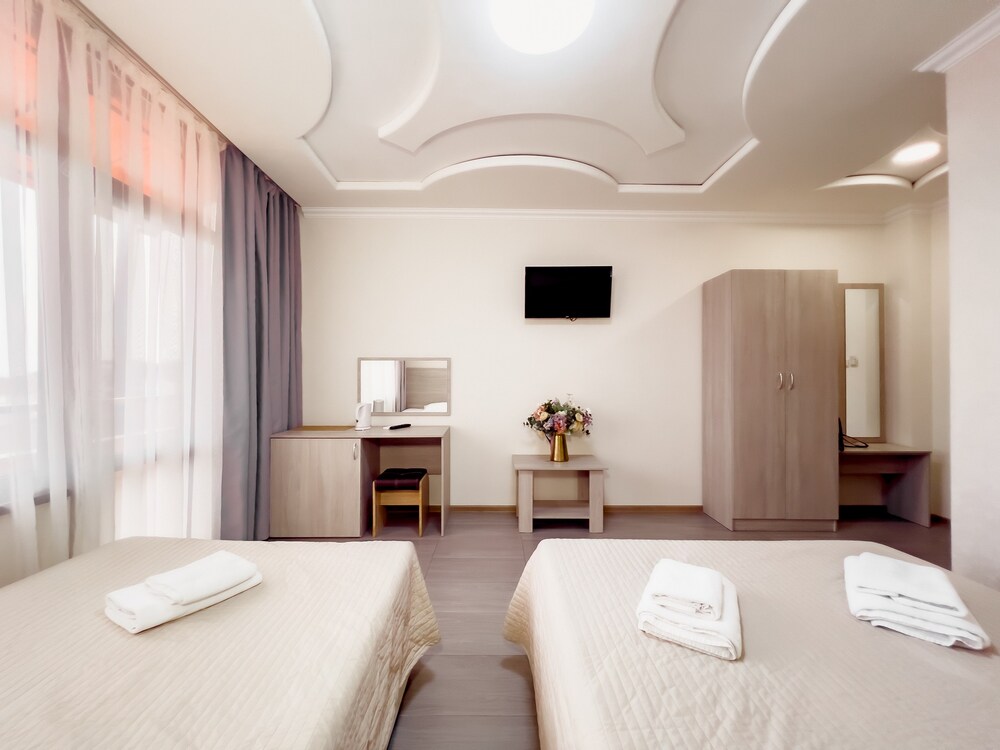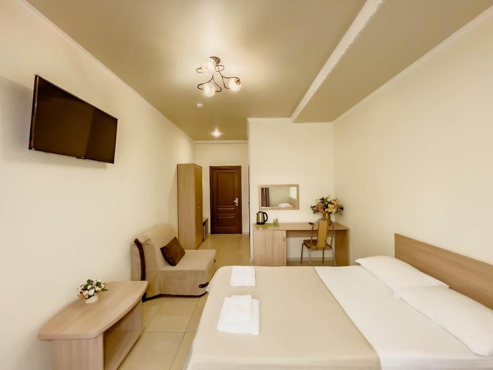 4-МЕСТН. FAMILY 20 кв.м. 1-комнатный номер оформлен в классическом стиле. В номере имеется все необходимое, включая удобную мебель, двуспальная кровать и два кресла-кровати, стол обеденный, стулья, кондиционер, телевизор, холодильник, Wi-Fi, фен, полотенца, набор посуды, некоторые номера оборудованы балконом. Собственная ванная комната. Вид на город/ горы. Расположение номеров: 3-6 этаж