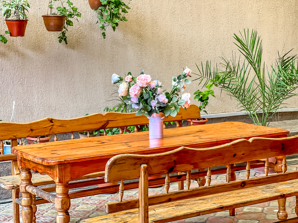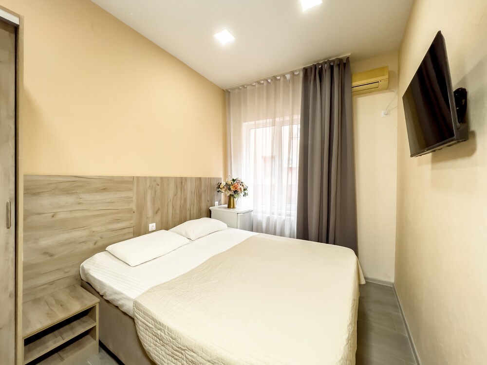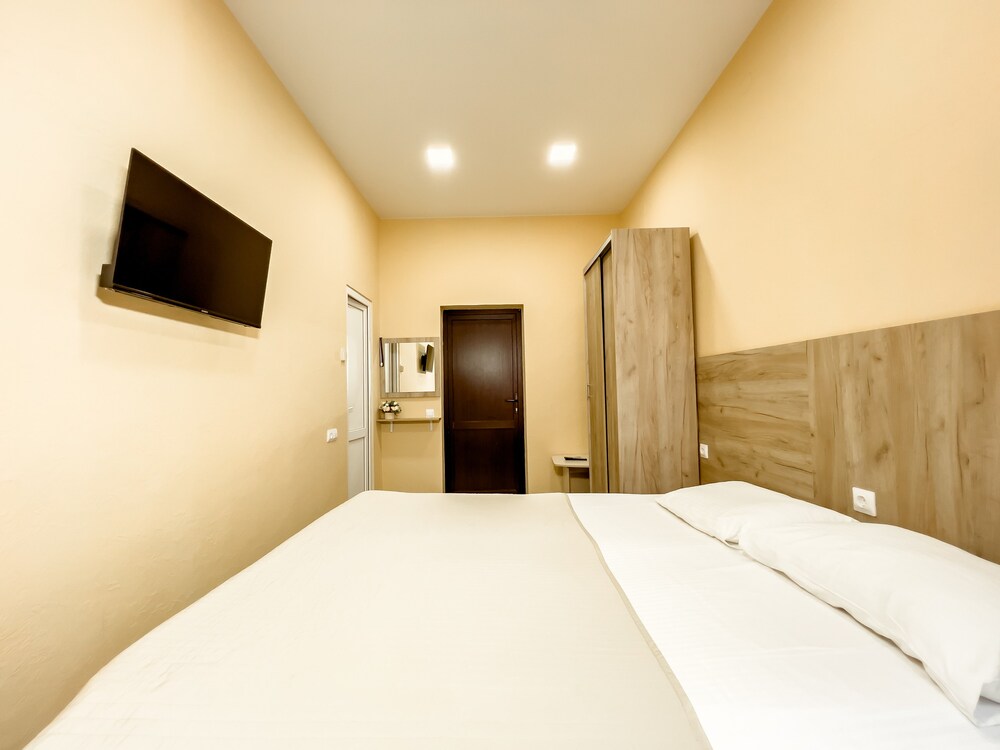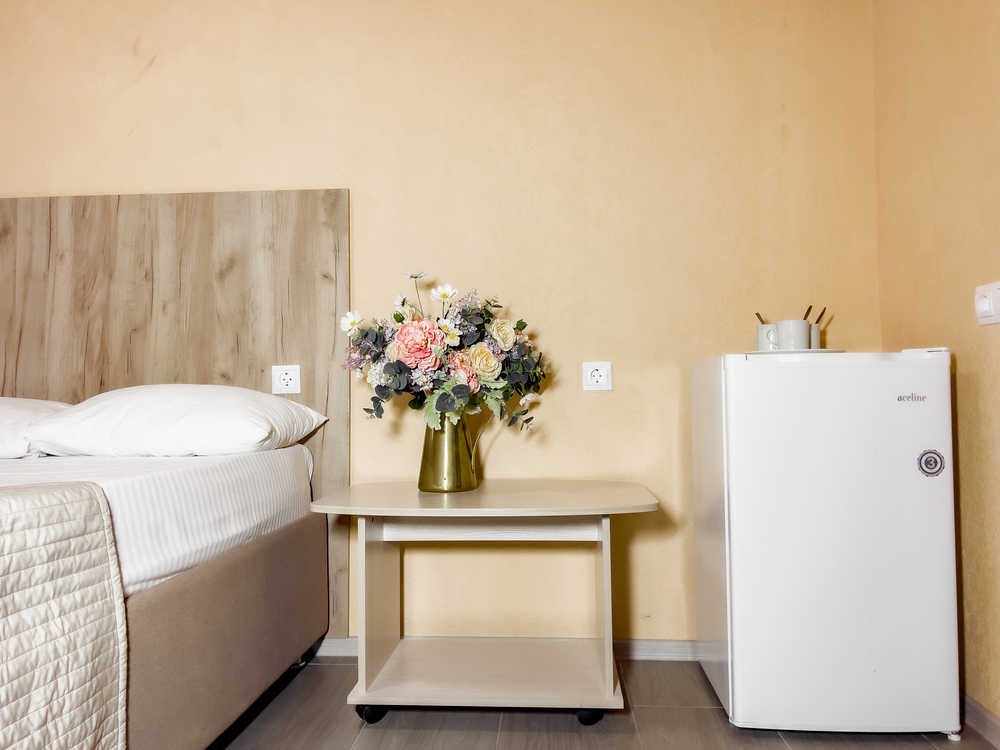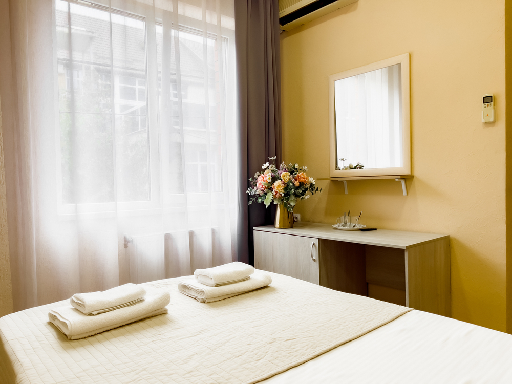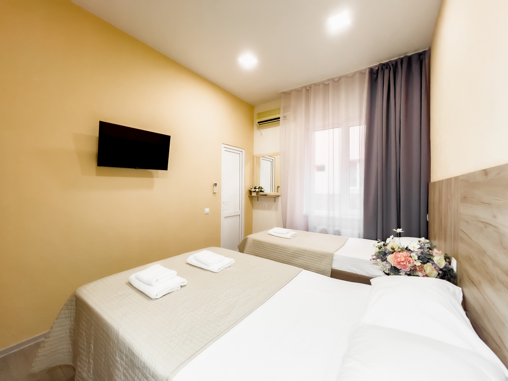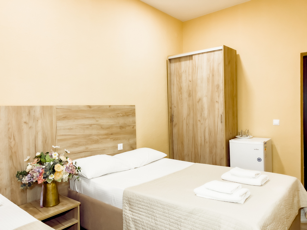 2-МЕСТН. STANDARD 12 кв.м. 1-комнатный номер оформлен в классическом стиле рассчитан до 2 гостей. В номере имеется все необходимое, включая удобную мебель, двуспальную кровать/ две односпальные, кондиционер, телевизор, холодильник, Wi-Fi, фен, полотенца, набор посуды. Собственная ванная комната. Вид во двор. Расположение номеров: 2 этаж