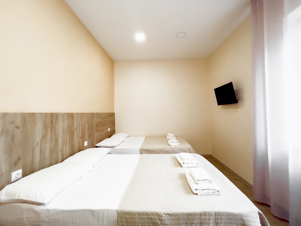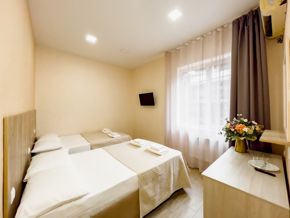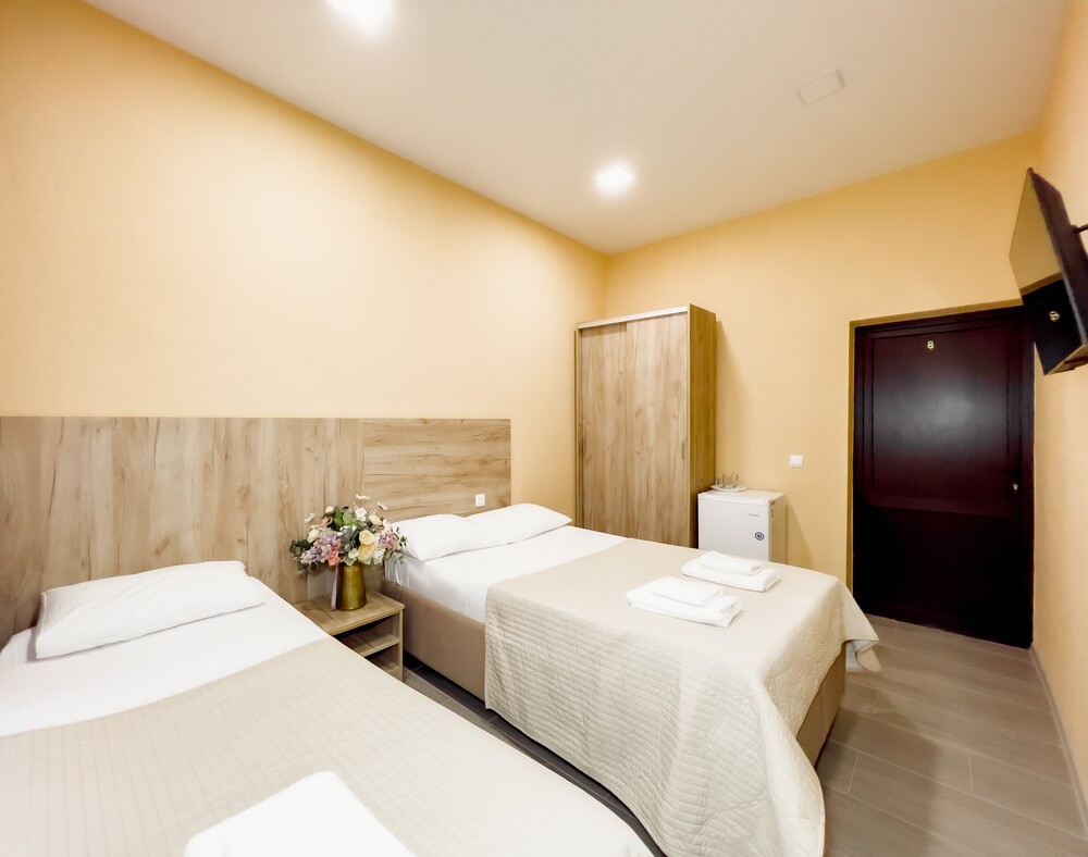 3-МЕСТН. COMFORT 14 кв.м. 1-комнатный номер оформлен в классическом стиле рассчитан до 3 гостей. В номере имеется все необходимое, включая удобную мебель, двуспальную кровать и односпальную/ двуспальную кровать и кресло-кровать, кондиционер, телевизор, холодильник, Wi-Fi, фен, полотенца, набор посуды. Собственная ванная комната. Вид во двор. Расположение номеров: 1-3 этаж