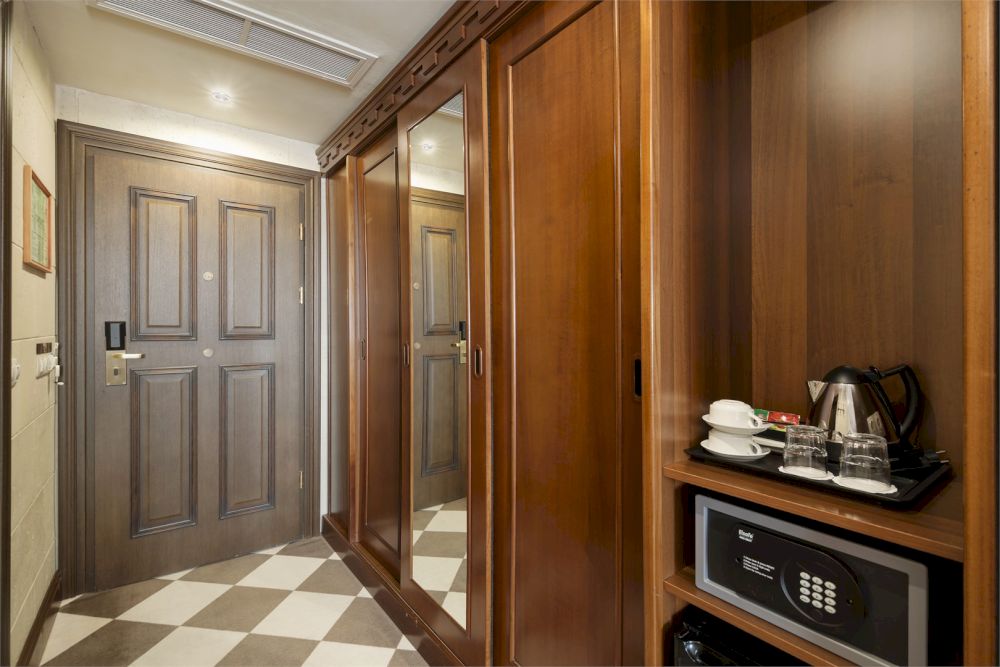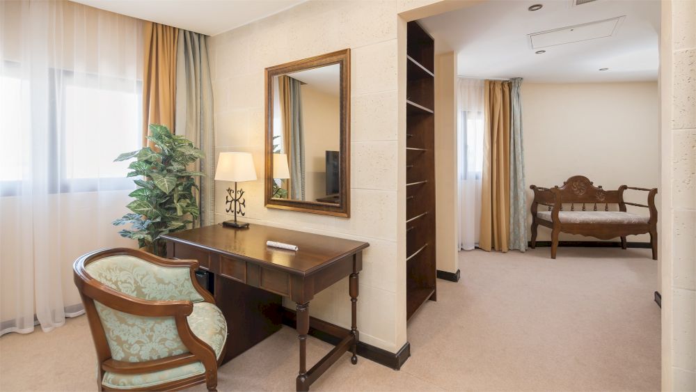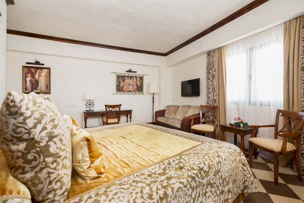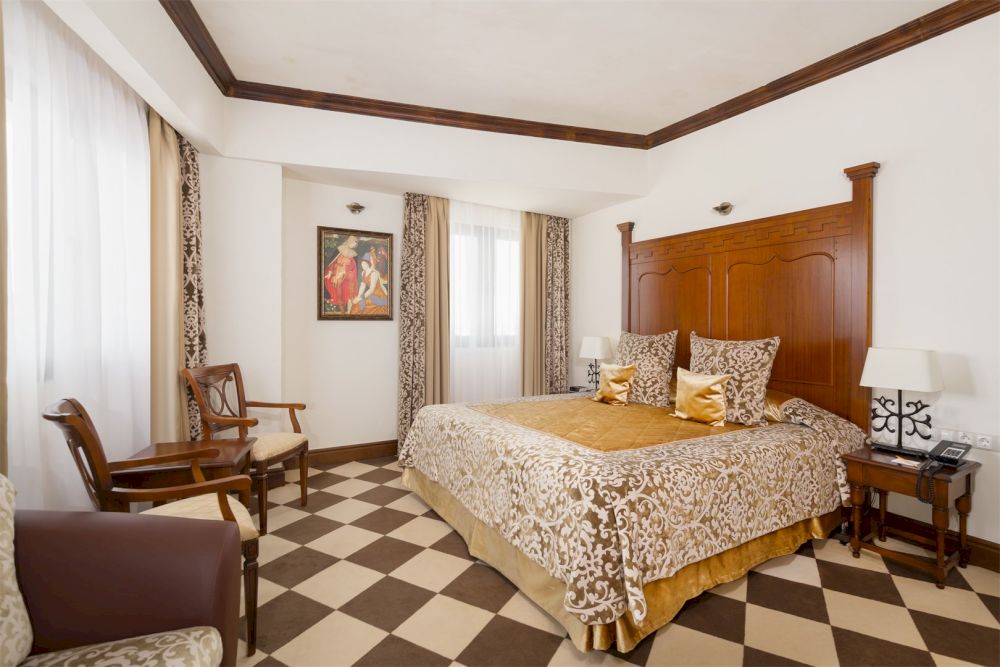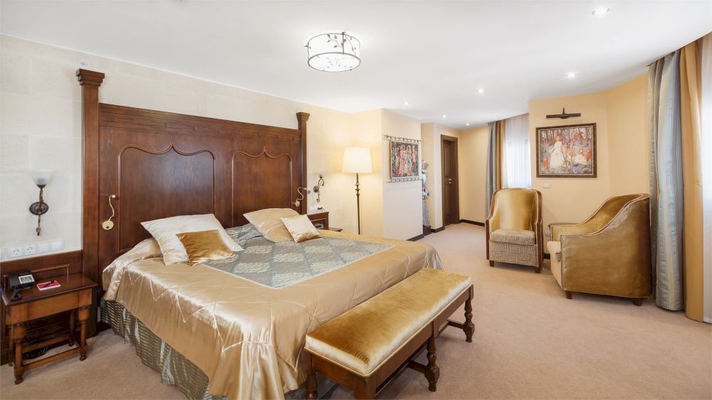 Сюит этой категории включает в себя спальную комнату с большой французской кроватью, гостевой санузел и просторную гардеробную. Доп.место -диван или еврораскладушка. В ванной комнате ванна и душ. Максимальная вместимость номера - 2 чел. 2 доп. места