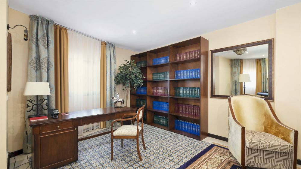 Люкс этой категории - двухэтажный номер На первом этаже двухуровневого люкса находятся гостиная с рабочей зоной и две спальни с индивидуальными санузлами. На втором этаже располагаются столовая-гостиная с террасой, массажный кабинет и гостевой санузел. Максимальная вместимость номера - 4 чел.
