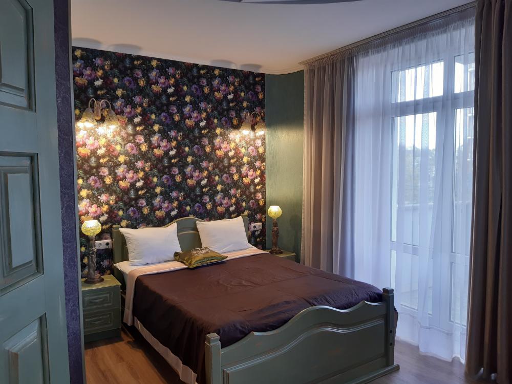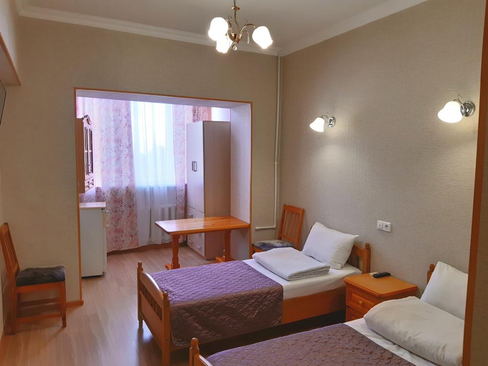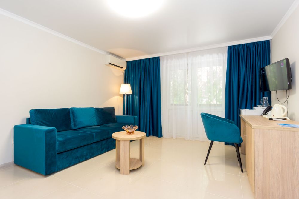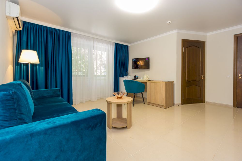 Номер улучшенной комфортности, просторный, с балконом, гостиной и спальней. Из гостиной комнаты вход в просторную ванну. В
