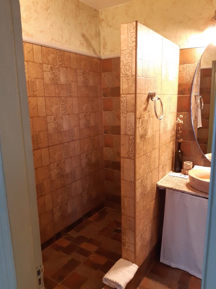 прикроватные тумбочки, шкаф для одежды с зеркалом, 2 стул. В ванной