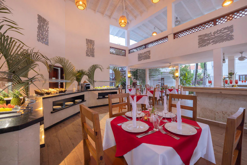 2ресторана-буфета, где подают блюда карибской кухни на завтрак, обед и ужин в уютной и расслабляющей атмосфере. Sky Bar – японский ресторан на крыше с инфинити-бассейном и захватывающим видом на океан. Работает для ужина (с 19:00 до 22:00), но не входит в пакет All Inclusive — оплата требуется отдельно. А-ля карт ресторан Sueño, где можно насладиться средиземноморской и доминиканской кухней 6 вечеров в неделю — также требует дополнительной оплаты.