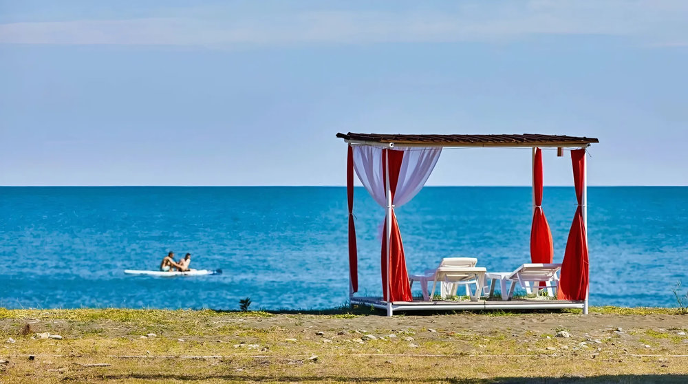 Парк-отель "Сосновый Бор" – уединенный уголок природы между реликтовым заповедником и морем, идеальное место для тех, кто ищет гармонию с природой. Отель имеет идеальное расположение: 20 га охраняемого заповедника с прямым выходом к галечно-песчаному пляжу. Рядом — уникальное солено-пресное озеро Скурча, где водится морская и пресноводная рыба. К услугам гостей: комфортное экологичное размещение в в двухуровневом доме типа А-фрейм или небольшом деревянном домике, кафе на территории, бесплатная парковка, SUP-серфинг, гидроциклы, сауна, детские горки, батуты
