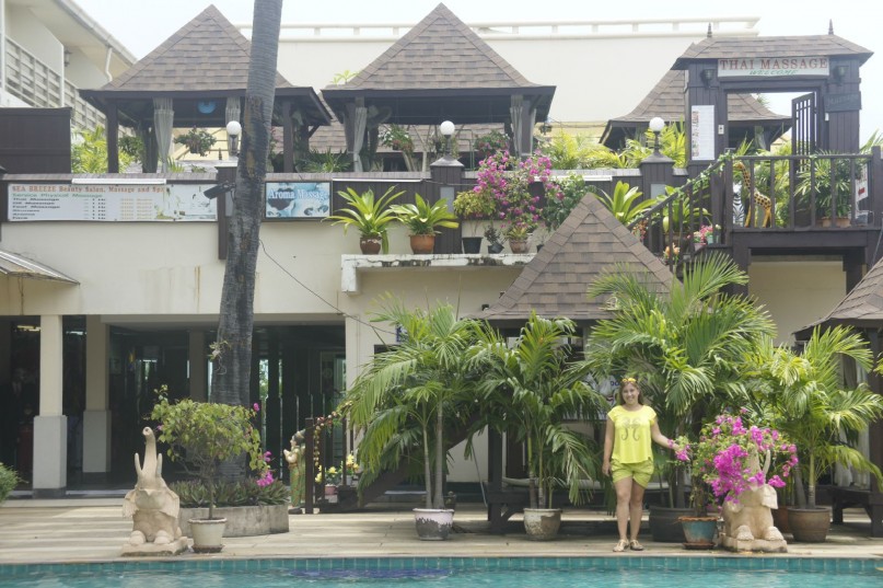 Как и было уже много раз сказано в предыдущих отзывах туристов, территория Си Бриза небольшая, но очень зеленая и функциональная - каждый сантиметр используется с определенной целью, при этом место здесь нашлось для всего необходимого: два открытых бассейна, достаточное количество удобных лежаков, клумбы, прудики, бары, есть большой массажный салон, бесплатный тренажерный зал, салон по пошиву одежды, магазин сувениров. При этом все это находиться внутри (или рядом) трех корпусов и образует достаточно комфортную и закрытую от посторонних территорию. Пару слов о бассейнах - большой половину дня находиться в тени, маленький - на солнце и к вечеру прогревается так, что в нем можно принимать горячую ванную. Нам,кстати, оба бассейна понравились. У большого есть зона джакузи, и сидя на удобных ступеньках под сильными струями воды можно делать бесплатный массаж спины (ощущения весьма приятные). Все отдыхавшие в Си Бризе узнают на фото свой отель по бассейному слонику - это "визитка" отеля. Непременно сделайте фото с ним - поддержите традицию! Что касается Интернета, то он,конечно, платный. Но цены приемлимые. До этого отдыхали в Паттайе в более комфортабельном отеле Гранд Джомтьен Палас, так вот там Интернет-цены откровенно кусались! А в Си бризе взяли вай-фай на неделю за 450 баттов. Но! В нашем номере на 7 этаже ловил не всегда, часто надо было выходить с ноутбуком на балкон, что очень неудобно (но дочь-подросток по вечерам там тусовалась ради общения с друзьями!). Ближе к ночи сигнал бы устойчивее! По мне - так зачем этот Инет на отдыхе в столь классном месте? Но иногда все же пригождался...