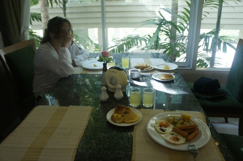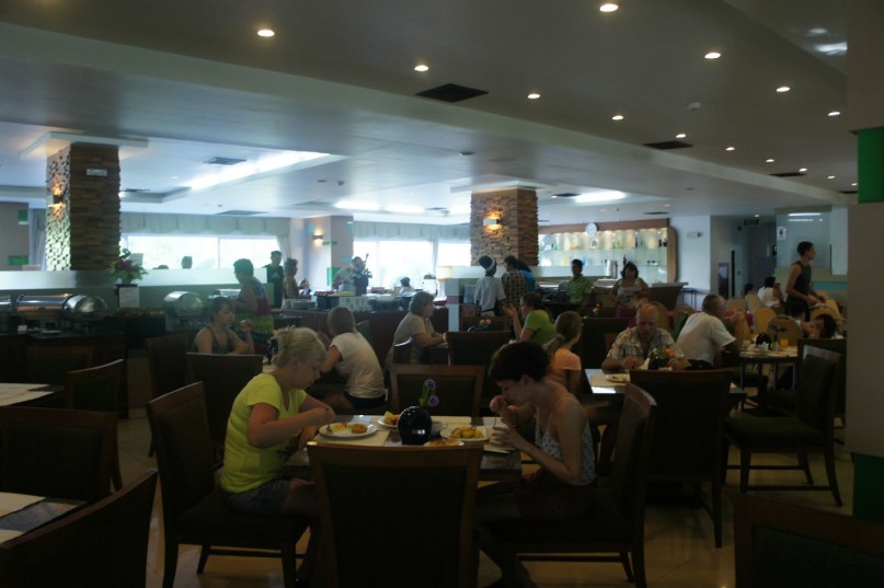 Завтраки проходят на 1 этаже основного корпуса с 6 до 10 утра. Вход в столовую по талонам. Столов много, обычно всем хватает, но чем дольше спишь, чем позже приходишь на завтрак, тем больше соседей будут с тобой кушать рядом. Ассортимент блюд в отзывах был описан уже сотни раз - еда разная, но немного с тайским уклоном. Есть и мясо, и овощи, и гарниры, и супы, и выпечка, и фрукты (арбузы, ананасы). Если будете чередовать блюда, то не приедитесь за время отдыха. Меню немного меняется раз в три дня, всегда есть омлеты, сосиски, круассаны, чай, кофе, разведенные соки. При желании можно плотно позавтракать и до вечера не вспоминать о необходимости перекусить в кафешке. Вынос любой еды из столовой строго запрещен - не позорьтесь и не пытайтесь что-нибудь прихватить с собой. Персонал расторопный, быстро убирает грязную посуду со столов и обновляет чистые тарелки и пополняет емкости с едой.