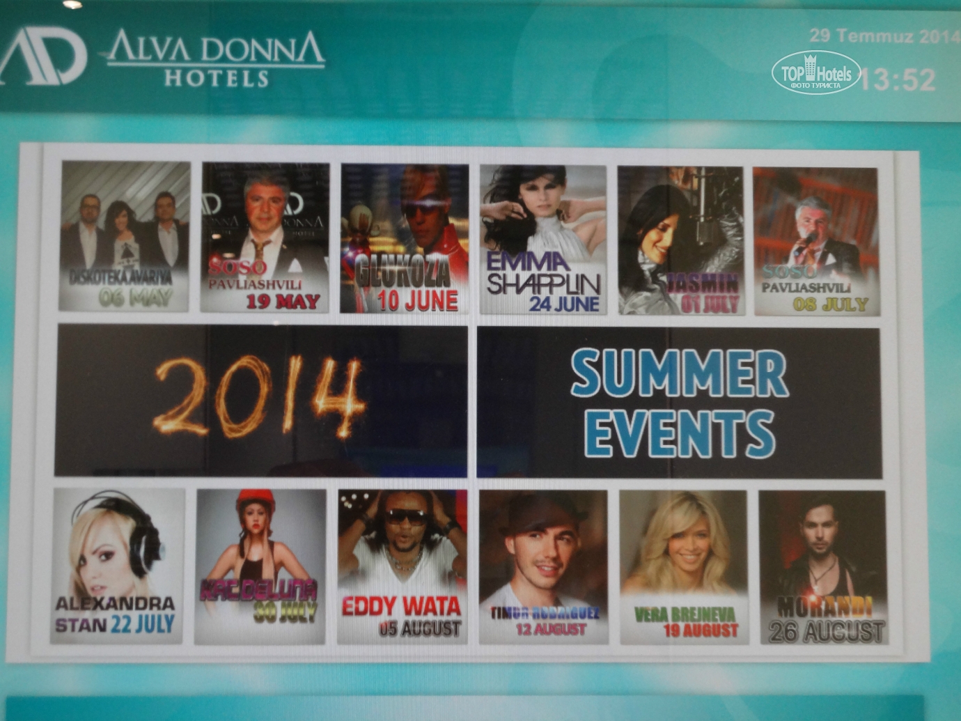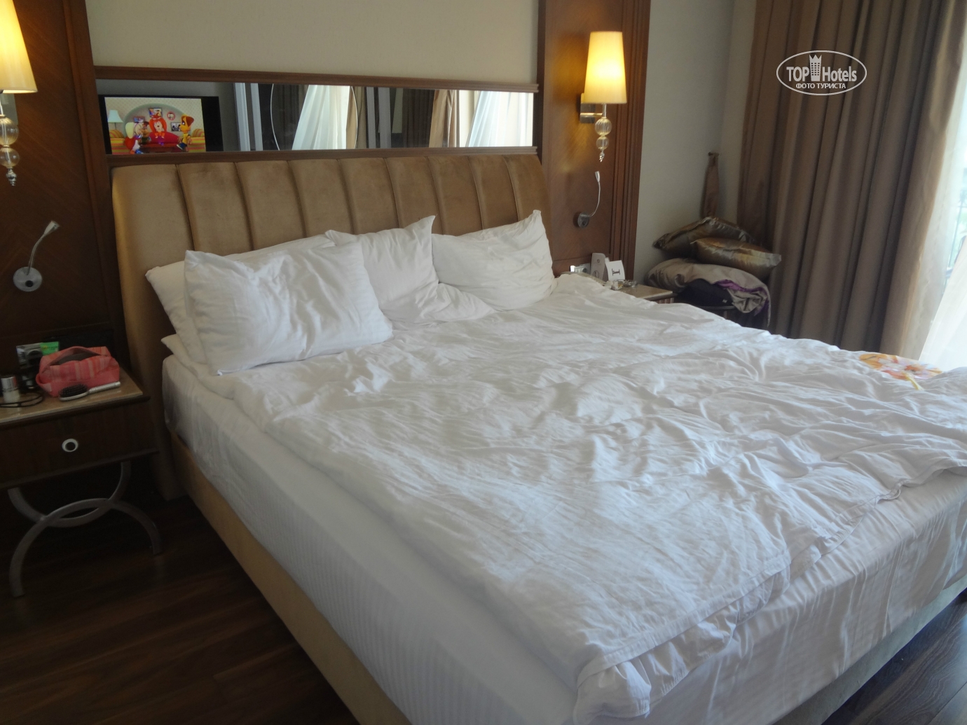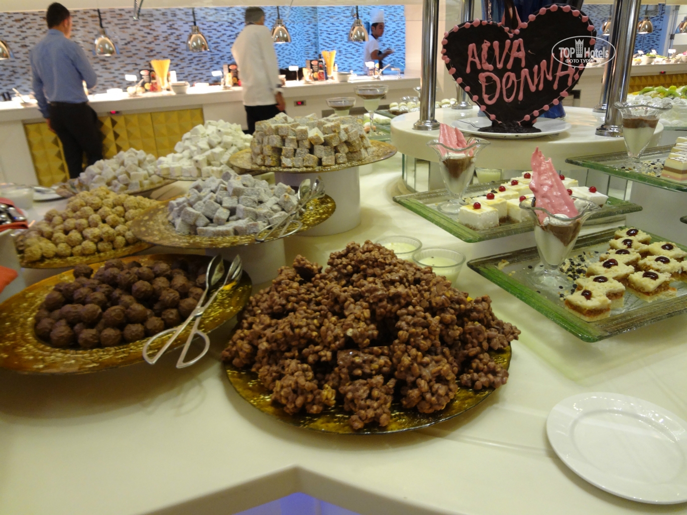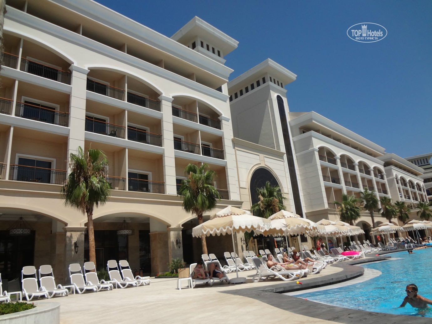 Спешу поделиться своими впечатлениями об отдыхе в Турции. За границу мы поехали впервые, ну и решили как и большинство туристов начать свой отдых с Турции! Отель Alva Donna Exclusive Hotel & Spa 5* порекомендовала нам кума, которая посетила его в мае этого года с 2 детьми. После чего, я сразу стала читать отзывы об этом отеле, привлекло то, что (а прочла я все отзывы за эту весну) было очень мало негативных отзывов и все негативные отзывы были написаны отдыхающими в основном корпусе, поэтому мы с мужем решили бронировать номер исключительно в релакс корпусе! Бронь сделали в начале июня и все последующее время я читала каждый отзыв об отеле, вплоть до вылета. Немного огорчило то, что недели за 2 до вылета отзывы встречались все чаще не очень, а именно про болезни детей (герпетический вирус, кишечная инфекция, ангина, какая то сыпь...) и я стала очень переживать, т.к. летели мы с ребенком... Итак, начну по порядку Отель бронировали через Coral travel, настоятельно просили тур оператора указать в ваучере релакс корпус! Ездили втроем (2 взрослых и ребенок 4-х лет), отдыхали с 18 по 31 июля. Перелет прошел замечательно, но вот в аэропорту в Турции пришлось немного понервничать... Как только подошел наш черед на паспортном контроле, на нас очередь не надолго остановилась((( Мой с дочкой паспорта проверили и отдали, стали проверять паспорт мужа и сразу стал куда то звонить и что то там говорить по турецки, потом вышел из своей кабинки с паспортом мужа, произнес его имя и сказал подождать одну минуту и ушел, не было его минут 10-15, но мне показалось, что прошло еще больше времени, что я только не передумала за это время, никогда ни за что не привлекались и тут вдруг такое в первый приезд за границу, я уже стала думать, что на этом наш отдых за границей и закончится! Потом он возвращается, извиняется, отдает мужу его паспорт и мы с немного подпорченным настроением продолжаем свой путь. Встретила нас очень приятная девушка ( к сожалению не запомнила ее имя), всю дорогу до отеля очень интересно рассказывала о Турции и экскурсиях. От аэропорта ехали мы в небольшом комфортабельном автобусе с кондиционером, дорога до Альвы заняла минут 50, по пути заезжали еще в 2 отеля, но нас это нисколько не напрягло, наоборот было все интересно. Размещение. После регистрации на ресепшине, нас сразу же проводили до номера, т.к. время уже было 5 вечера. Наш номер был 2425! Номер был очень уютный, красивый, сразу было видно, что все новое. Когда вышли на балкон счастью нашему не было предела, вид с него был просто потрясающий, справа были видны корпуса и релакса и основного, слева магазинчики и соседний отель, а посередине море! После осмотра номера мы с мужем поняли, что он подготовлен только на двоих, на ребенка ни чего не было, но нас это не смутило, мы прошли на ресепшин попросили горшок для ребенка, на следующий день я уже подошла на гест релейшн (к Яне) и попросила для дочи халатик, тапочки, полотенце, какую-нибудь подставочку под раковину, чтобы умываться (но к сожалению, мне сказали, что таковых не имеется), приходилось заходить в душ и мыть ребенку ручки там, но мы не расстраивались из-за этого и попросила еще дополнительную сушилку для белья, т.к. уж очень она была мала, но мне сказали, из-за большого количества отдыхающих в самый пик сезона, у них с этим проблема, но и тут мы нашли выход из ситуации, развешивали стирано