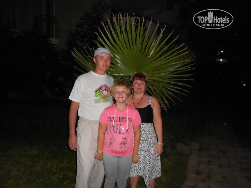 Отдыхали в отеле в сентябре 2011 года. Размещение прошло без всяких доплат, в номере убирались каждый день. Питание хорошее, только мясо мало, в основном курица, индейка и очень вкусная рыба - но это Турция, его и не следовло ожидать:) Анимация в основном только для детей, для взрослых почти не было, только зазывали на дискотеки в Аланью. Вечером возле отеля гулять негде, так как отель находится в деревне:) Море прекрасное, вход хороший - галька, плиты каменные не мешают, вход на пляж по тоннелю - очень удобно. Бассейн большой, горка тоже не плохая, места всем на лежаках хватает. В целом отель неплохой - свою четверку отрабатывает:) Рекомендуем для семейного отдыха с детьми.