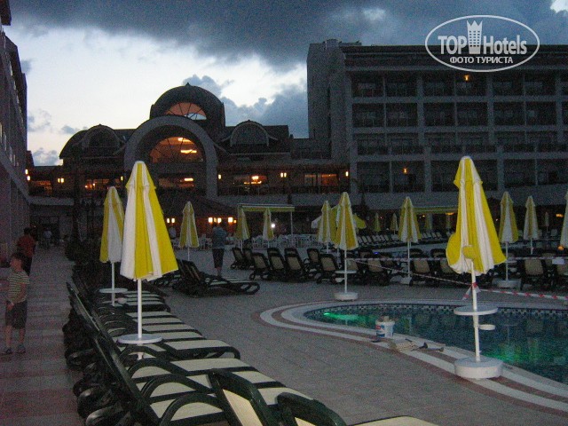Доброе время суток. Только приехали из Турции спешу поделится впечатлениями об отеле.Отель новый и красивый расположен в местечке Евренсеки (Evrenseki)в 5 км. от Сиде. Номера очень красивые и уютные. Приехали мы из Анталии в 19-00 в номер нас сразу заселили. Доплачивать ничего не пришлось. Номера все новые. В номере плазменный ТВ идет четыре канала на русском языке, кондиционер отдельный, балкон,холодильник (постоянно пополняется напитками и водой каждый день),сейф (у нас оказался бесплатно).Отель большой с непривычке можно заблудиться.В номерах уборка каждый день.Персонал вежливый и внимательный.Еда отличная много фруктов зелени выбор большой.У нас в ванной ручка сломалась позвонили на ресепшен починили в течение 10 минут и от чаевых отказались (не принято).Очень много поначалу было немцев,анимация на немецком языке,тоже был но потом пригласили девочку и она переводила.Пляж у отеля собственный песок, очень чистый.Матрасы, шезлонги и полотенца бесплатно но если хотите поменять полотенца нужно заплатить 1 у.е..Пляж от отеля в 200 метрах нужно пройти мимо канала.В канале можно увидеть форель метровых черепах и крабов.Никакой канализации туда не сбрасывают как писали ранее в отзыве.На пляже бар бесплатно пекут лепешки с 10-00.В отеле есть два ресторана по записи( рыбный и турецкий) в неделю можно посетит оба.Запись в лобби с 10-00 до 11-00.Все напитки до 24-00 бесплатно. Дискотека тоже в отеле проходит с 24-00 все напитки платно.Есть ночной буфет с 24-00 до 2-00 кто не наелся. С 14-00 до 15-00 мороженное бесплатно.Очень хороший и чистый бассейн и три горки. Есть детская комната и анимация для детей.Если есть вопросы отвечу:obo2006@tut.by
