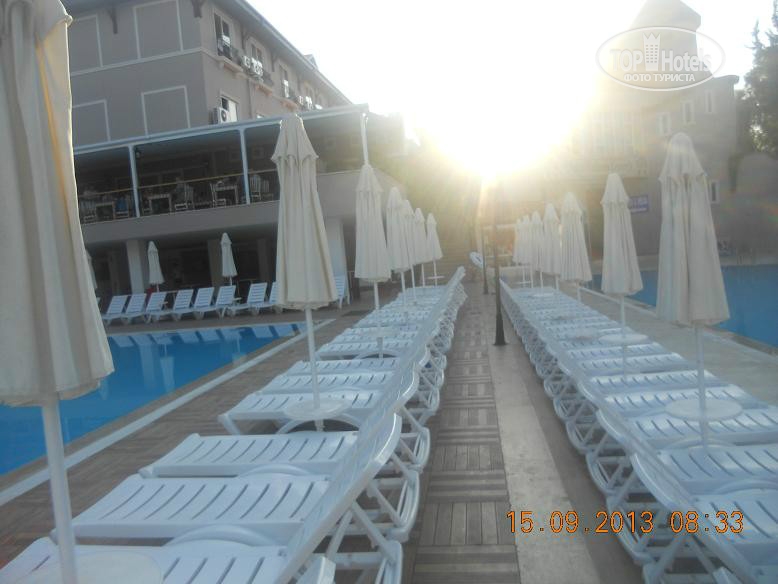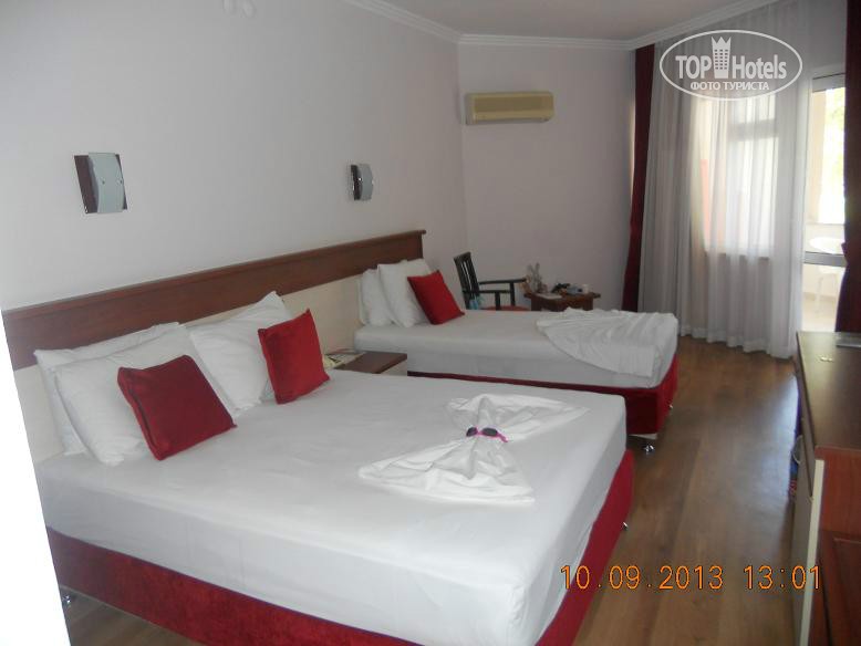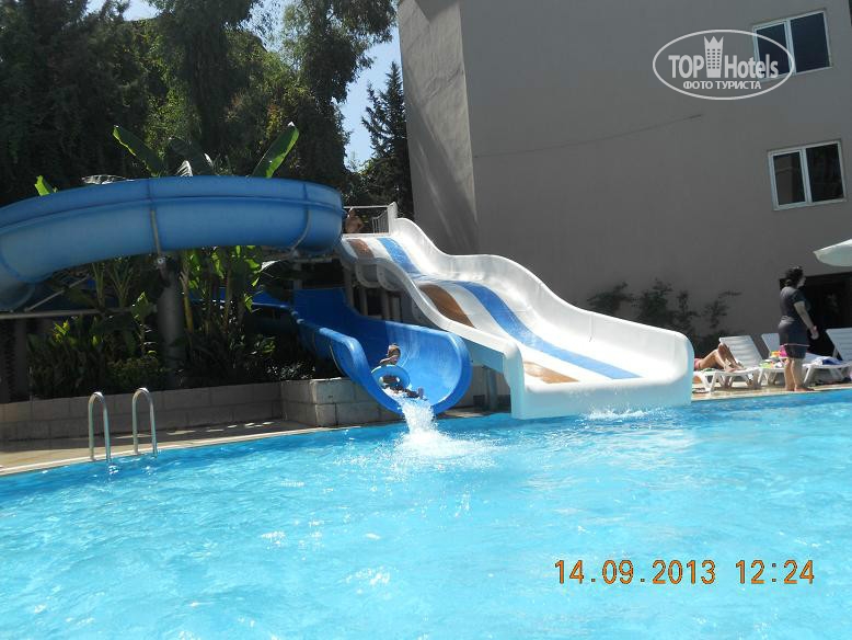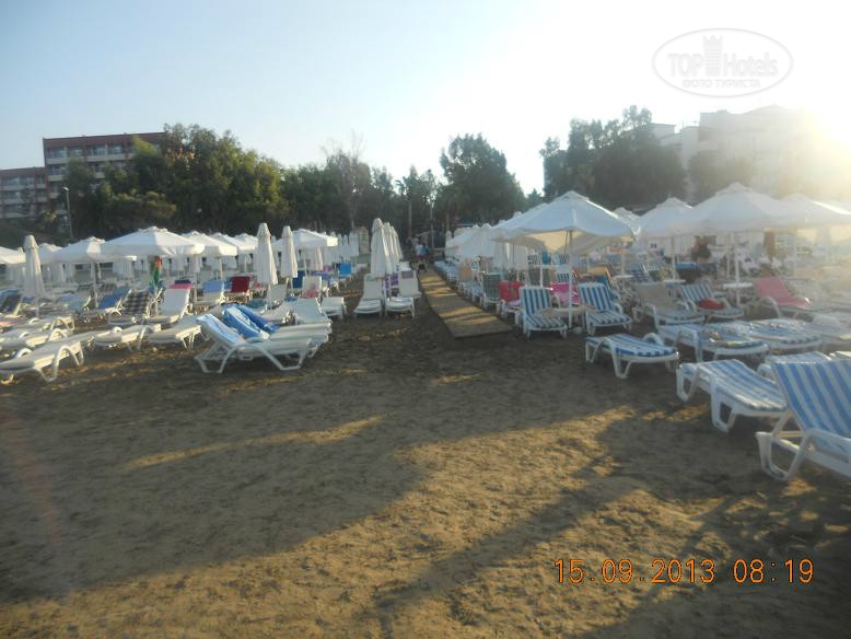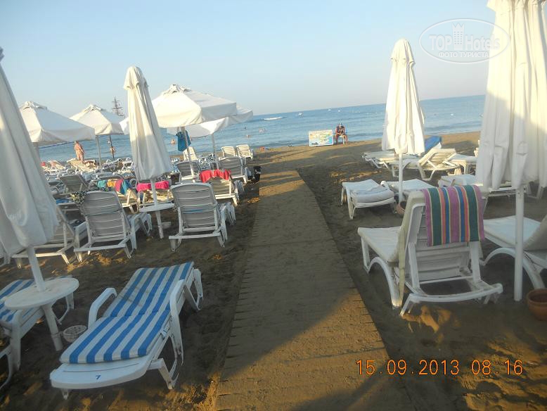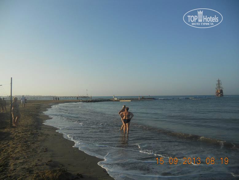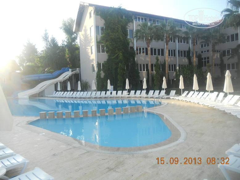 Всем привет, решившим познакомиться с нашим мнением. Скобари, это Псковичи, вот откуда нас занесло. город небольшой, народ простой, неизбалованный, в отличие от некоторых ;) намек понят? ну, погнали! тут даже рифма родилась : отзыв - не отзыв, рассказ - не рассказ, напечатаем для Вас. прибыли Мы (папа, мама, доча 5,5лет) 07.09 в 18-45 в аэропорт Анталии. в 19-00 уже в автобусе. ехали от Тез-Тура. у них все оргназовано на отлично (ВНИМАНИЕ!!! не реклама!!!, так уж оператор нам попался при выборе путевки). в отеле были в 20-40 нас сразу обраслетили и проводили в столовую на ужин. поесть было что и с дороги мы свой голод накопившейся на все 100 утолили. по выходу из столовой нас расселили. как Вы уже, наверное, начитались в имеющихся отзывах, соглашусь, жить во 2 и 3 корпусах лучше. без доплат и споров нас поселили в номер 3403 (третий корпус четвертый этаж номер 3). НОМЕР: нас устроил! чистый, достаточно места, комфортный! УважаемыеЕЕЕ!! Вы же в 4* приехали, будьте реалистами и не пишите хрень про неудобства! фото прилагаю. итак, как написал, кровать для мамы+папы и однушка для чада. рядом тумбы, пара стульев, трюмо со встроенным холодильником, не морозит, правда, и если Вы пельмени планируете хранить, Вам будет некомфортно, но напиток из дьютика, по крайней мере у меня, был всегда холодненький, что не могло не рабовать . на стене плазма, которая, к сожалению, отказалась читать привезенный диск с мамапапиными фильмами и ребенкиными мультами ;) приходилось пялиться в бук... ну да ладно, мелочь! на входе шкаф бельевой, на одной полке стоит сейф. платный. 1,5 бакса в сутки. мы не пользовались. переодевки было достаточно. припрятали, поприжали, подзакрыли в чемодане ценные вещи и не парились. кто боится - дверь с собой бронированную с пуленепробываемым глазком везите :) ТА ДА ДА ДАМ ванная комната! многих, наверняка интересует что же там?! о ужас! почитал я написанный совсем недавно кем то отзыв, так у людей, представляете!, тссс, канализацией пахло!!! О! ДА! если Вы набухавшись по-русски, уснете с унитазом в обнимку, есесенно запахнет! Дальше, помните, начальные выпуски comedy club, где Галыгин про туалет говорил, что он ассоциируется с Голландией,, потому что неровно положенный кафель клали какие-то пи...сы :) ЧТО КАСАЕТСЯ НАШЕГО НОМЕРА все было ОТЛИЧНО! чисто и аккуратно и РОВНО в санузле зеркало с полочкой, полотенцедержатель, пара крючков на дверях (КСТАТИ!, слышал недовольство какого то, простите жителя Столицы знакомой страны... номер ужас! в ванне всего 2 крючка, полотенца висят, так мне плавки, говорит, повесить некуда!... no comments…) в ванне фен маленький, бюджетненький..., дует унитаз ЧИСТЫЙ, если Вы сами за собой щеточко вжик вжик... про душ напишу так... жаль, конечно, что нет, хотя бы душевого поддона. в полу сделано небольшое заглубление на 3-5 см. кафельное. да, брызгается, но если вам не сложно, делючь нашей хитростью (кстати в каком то отзыве автор так же использовал этот способ) полотенце для ног постелить на пол и наслаждаться чистотой и сухостью в Вашем сан.узле. да, кому любопытно... два диспенсера для жидкого моющего средства. у зеркала - мыло, в душе - для геля для душа. аромат обалденный. так что, сравновать только Вам! как просит модератор ТЕРРИТОРИЯ ОТЕЛЯ , ПЕРСОНАЛ территрия неюольшая, как и во многих отелях Турции, но уютная. пара бассейнов, кафель, дорожка из тротуарной плитки, которую не моют от птичь