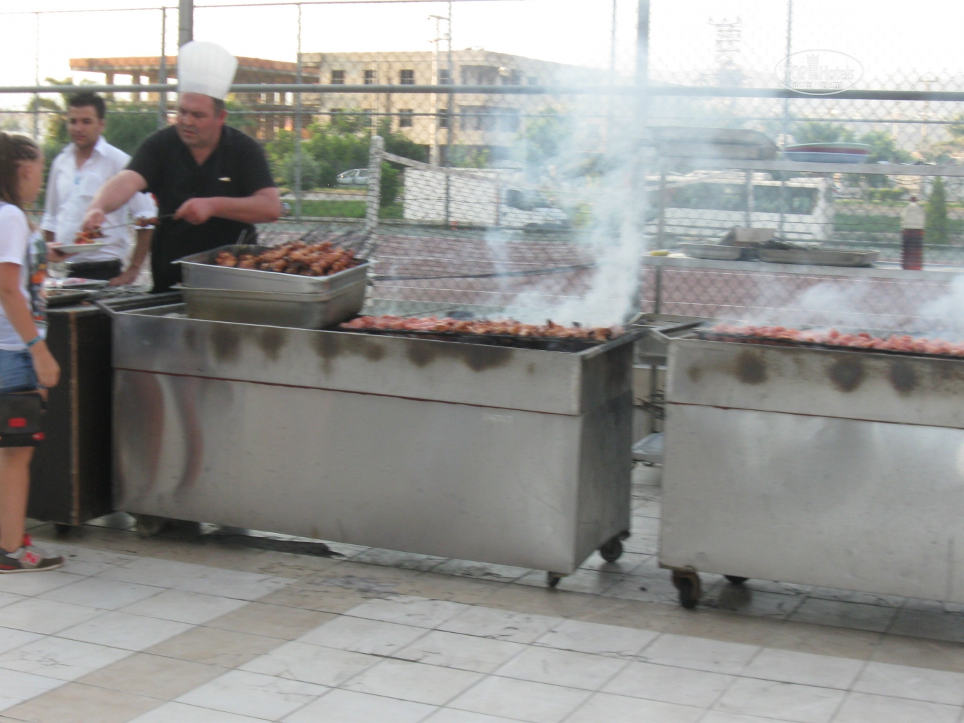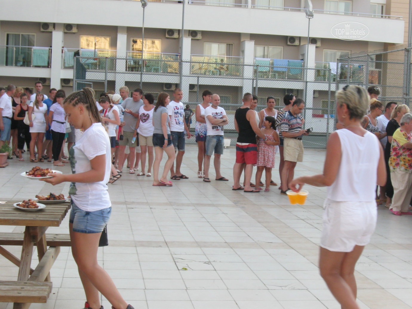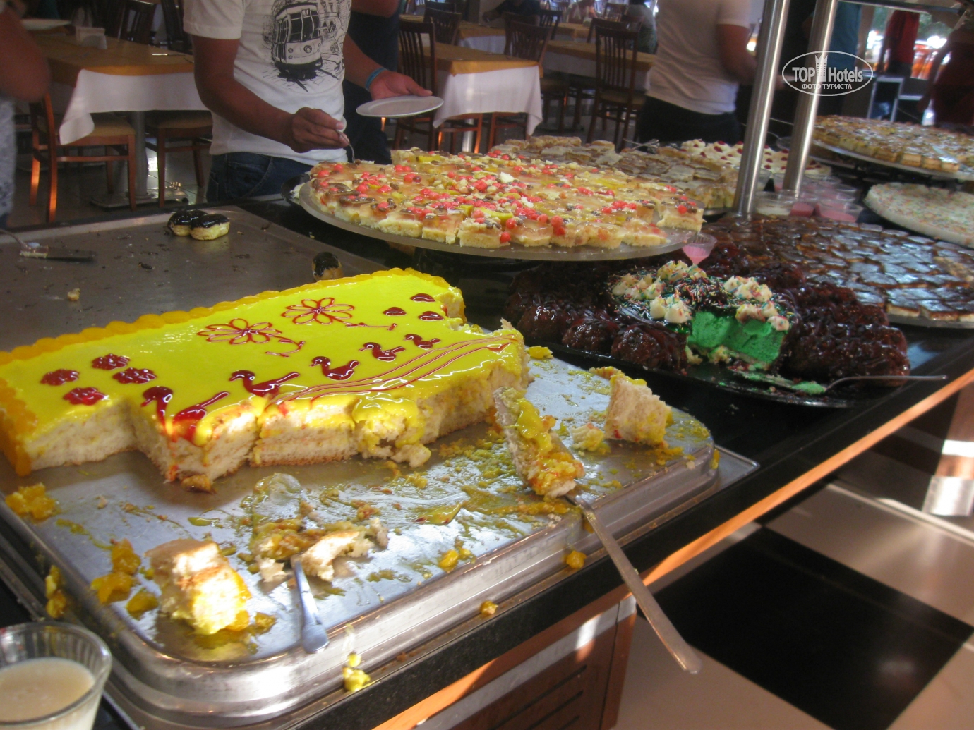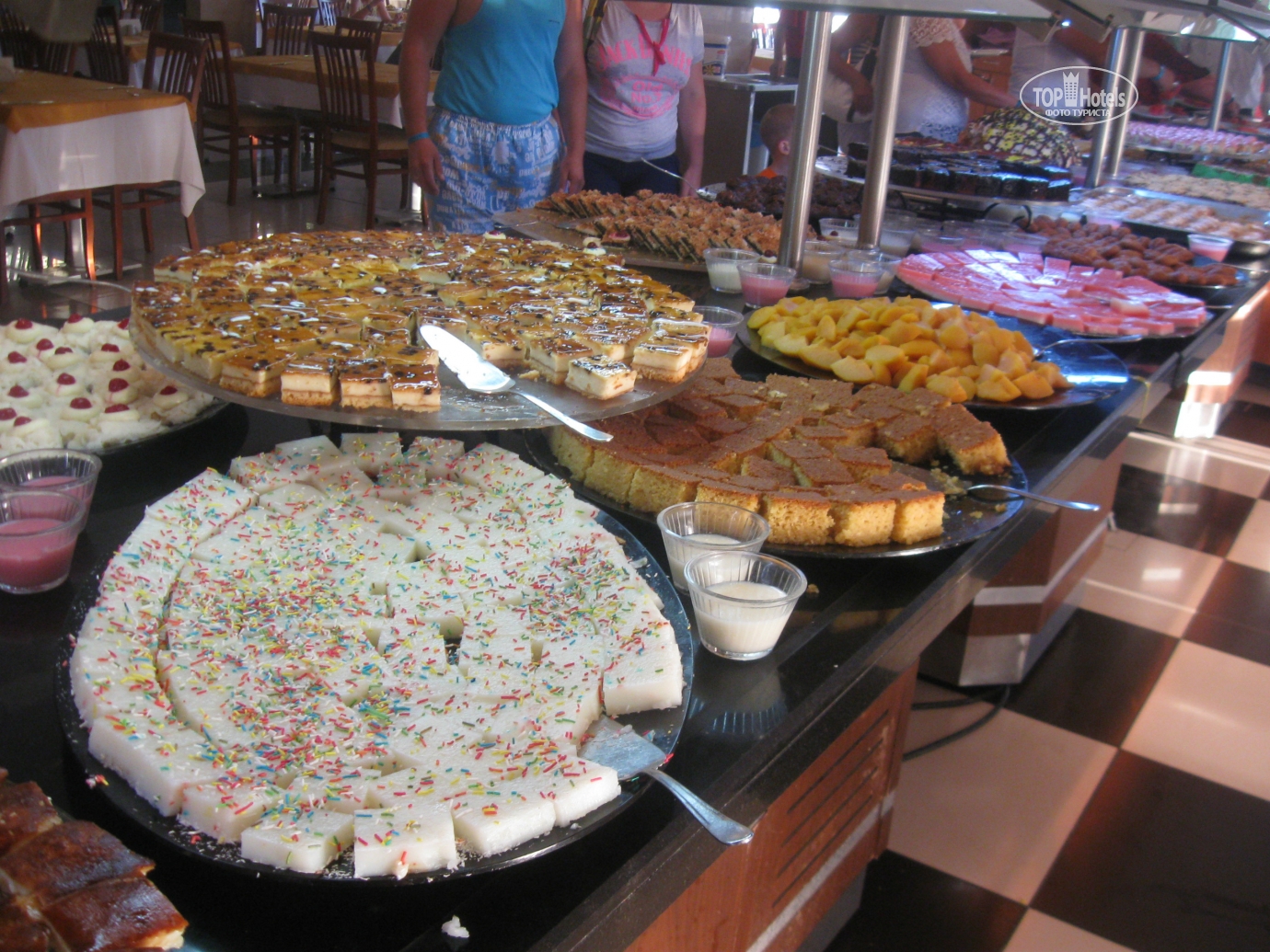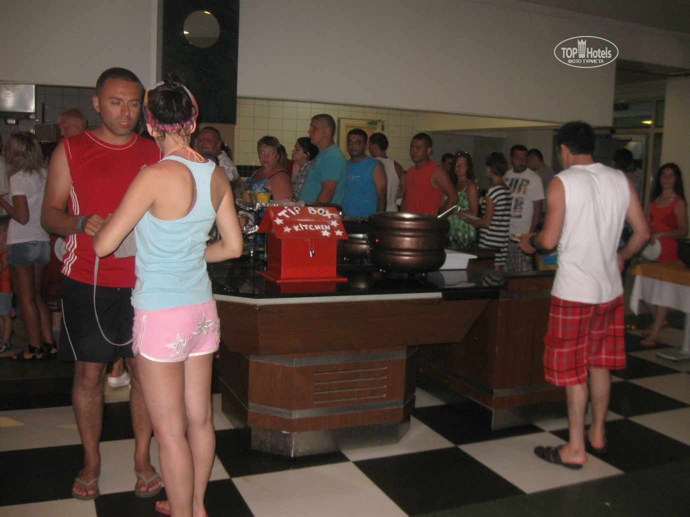 Отзыв мой будет очень длинным, но думаю, полезным! Начну все по порядку. Поехали мы на отдых трое: я, муж, ребенок 3 года. Сама я работаю менеджером по туризму и при выборе тура, предложений было очень мало, выбирали из остатков и на многое я закрыла глаза, в т.ч. на отзывы, ссылаясь на привередливость туристов. Сначала коротко (для тех, кто не любит длинных историй): на ресепшене девушки-админы - просто ужас; постоянные, унизительные очереди за едой, чуть ли не бои за нее; еды много, но половину есть не возможно; фруктов - мало, вкусная кондитерка и мороженное; анимация - хорошая, море каменистое, но купаться можно. Приехав в отель к часам 12.30, на ресепшене нас встретили с улыбкой, сказали, что номера приводят в порядок после туристов, а мы пока что можем сходить в рестаран и покушать. Я знаю, что по правилам отеля нас могли заселить только к 14.00 - поэтому вопросов не было! Спасибо на том, что разрешили пообедать. Спустившись в ресторан, я была мягко говоря в шоке: огромная толпа народа, все толкаются, носятся как угорелые, огромные очереди, нет свободных столов и вилок! Объясняя мужу, что нет вилок, ко мне подлетела официантка и сказала, что вилки будут! Ни прошло и минуты, вилки были! Пообедав, мы пошли снова на ресепшен, где нам дали номер на втором этаже! Вид из окна выходил на крышу перехода в другой корпус и на соседний корпус соответственно. В принципе-то, меня это вполне устроило, т.к. я хотела, чтобы было потише. Муж с удовольствием начал раскладывать вещи, а я принялась доставать лекарства для ребенка, чтобы убрать в холодильник, т.к. их нужно хранить в прохладном месте! Лекарства были банальные, но всегда полезные для ребенка: деринат и цефекон свечи. Какое же было у меня удивление, когда я открыла дверцу шкафа, где должен быть этот холодильник и не обнаружила его... дальше - больше, я обнаружила, что у нас не работает сейф. Я тут же спустилась на ресепшен, где объяснила ситуацию. На что мне сказали, что сейф починят завтра, холодильник также будет завтра. Я опять стала объяснять, что у меня лекарства, да и по пляжу с документами до завтра я не намерена разгуливать! Попросила другой номер. До меня стояли люди с абсолютно такими же проблемами и им дали карточку от другого номера. Также и мне разрешили осмотреть другой номер. И опять удивление: я захожу в этот номер, а там сидят люди, которые стояли до меня и задают вопрос: Вы кто? Состояние шока, опять поход на ресепшен, опять дают карточку уже от другого номера. Захожу в номер (первый этаж) в сопровождении сотрудника отеля, он указывает на сейф, холодильник и т.д. В этот момент я слышу крики, выхожу на балкон, а там отличный пейзаж: кусты, через которые прослеживается бассейн соседнего отеля, где люди катаются с горок с бешеными воплями. Понимаю, люди отдыхают, но и я с ребенком должна также отдыхать, а не слушать крики с утра до ночи! Опускаю глаза под балкон, а там вырыт ров, наполненный мусором. В общем, крики, вид на кусты и на помойку меня не устроил. Сотрудник отеля сказал, что ни чем тогда помочь не может! Я спросила, нельзя ли из этого номер холодильник принести к нам, на что получила ответ: у нас так нельзя! Я обратилась к представителю нашего туроператора, но толку от этого было мало! Всем было по фиг, а толпа недовольных туристов накапливалась. Пошел муж налаживать контакт, даже предложил деньги И ВЫ НЕ ПОВЕРИТЕ: 