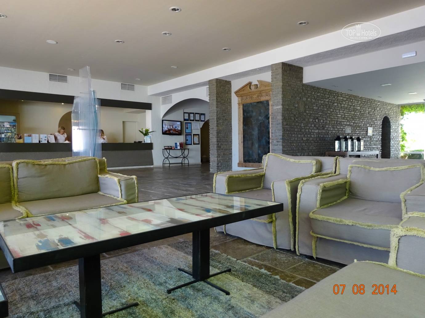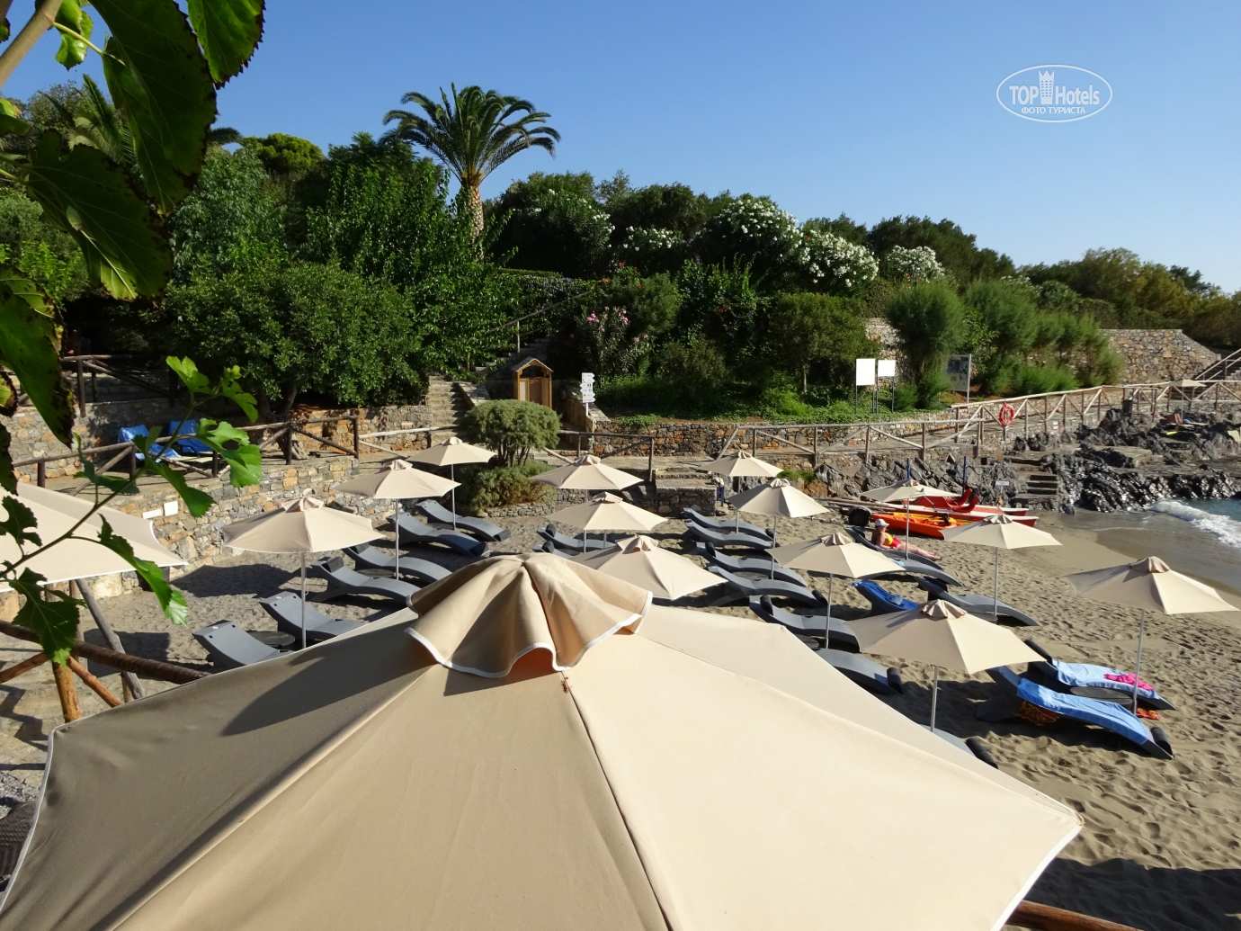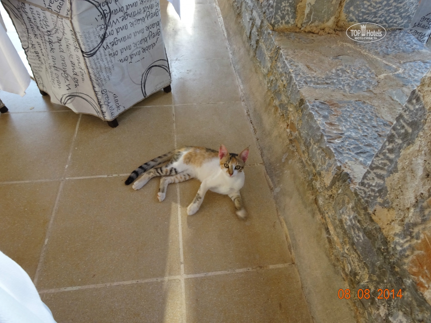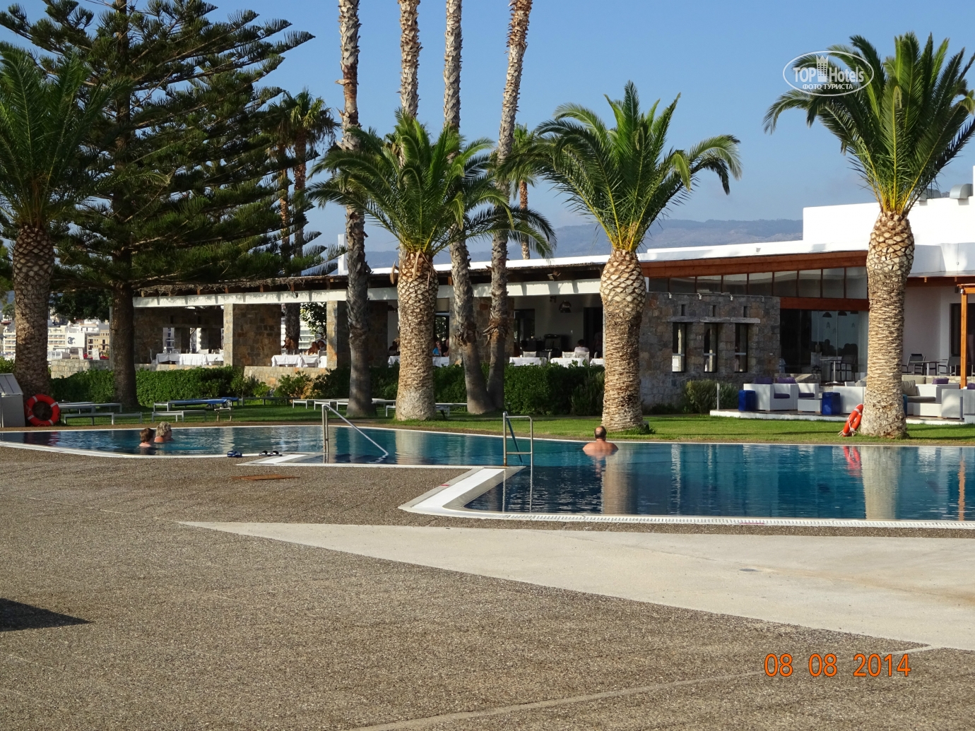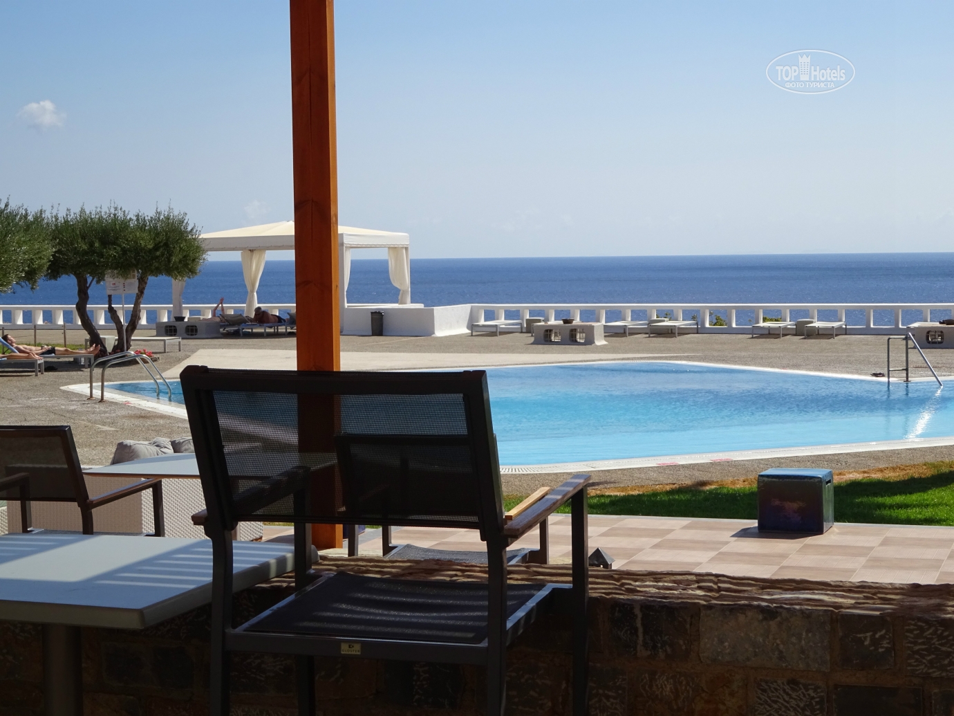 Добрый всем, день! Вчера 10 августа прилетели из Греции, хочу поделиться своими впечатлениями. Прилетели мы туда 3 августа в отели были в 9 утра, до отеля из аэропорта 80 км, ехать около часа, заполнили обязательную анкету и нас направили на завтрак, после чего нам сказали, что наш номер не готов и придется ждать до 13.00, а учитывая то, что мы в принципе еще не спали, в самолете как то не получается у нас спать, то мы настаивали хотя бы какой то на время номер, но нам было отказано, на ресепшене и вообще везде, персонал не говорит на русском, имей те это ввиду, я общалась с ними через переводчика на Гугле. Пошли гулять по территории, посидели на террасе около ресепшена, в баре....в общем как то до 13.00 дотянули, но было очень тяжко, нас привели в номер и опаньки, номер не тот, у нас был заказан номер с спальней, и гостиной отделяющее их дверью, то есть две комнаты, а нам дали однокомнатный номер(причем с одной кроватью, так как я была с мамой, то нам нужны были две кровати, пришлось одной из нас спать на диване, там по два дивана).Мы пришли сразу на ресепшен, чтоб решить эту проблему, на что нам сказали, что это именно тот номер, который у вас стоит в ваучере, я начала звонить нашему гиду Эдгару, особое спасибо ему, очень хороший гид, прекрасно говорит на русском, и мы через него стали общаться, итог, сказали что придет старший менеджер в семь вечера и все прояснится, но придя в семь вечера на ресепше, было сказано, что он не сможет прийти из за каких то его проблем, и нас переселят завтра после завтрака. На следующий день, нас переселили как и говорили после завтрака, в тот номер который нам и положено(номер с двумя кроватями, два дивана, на террасе, два стула, стол, два лежака), на сколько мы поняли, нам включили бесплатно к FB(который у нас был) еще и напитки бесплатно, как говорится презент за такой конфуз, мы это поняли потому, что когда мы заказывали тур, сказали что нам не будут входить бесплатно напитки. Ну бутылка вина при заселение, это да, было. В общем конечно сгладились со временем такое отношение, но в начале мы разочаровались в этом отеле. Уборка в номерах, чисто формально, ничего не протиралось, менялись только полотенца и то те, которые валялись на полу, чаевые не советую оставлять, поверти, ничего не измениться, пробовали. По поводу территории, очень нам понравилась, вид вообще из этого отеля, из любой точки просто восхитительный, отель находится отдельно ото всех отелей и дороги, как бы на своем островке, что очень здорово и никто не может прийти лишний, конечно для тех кто не любит лестницы, не советую этот отель, там лестницы повсюду, и очень много, чтоб спуститься к морю, нужно пройти по нескольким лестница, ну в принципе хороший фитнес. Зелени достаточно, много цветов, территория красивая и большая, но особо не погуляешь. Питание там хорошее, голодными мы не были, завтрак как в принципе и везде, одно и тоже, обед проходил в ресторане возле пляжа, по меню, из рыбы была только рыба-меч, остальные виды рыб почему то не входили в FB, ужин тоже понравился, разнообразный и мясо и рыба и картошка и макароны, и много овощей. По поводу пляжа, маленький пляж, лежаки пласмасовые, с подголовниками приклепляюшеми тоже пласмасавыми, очень не удобные, мы на травкевсегда занимали лежаки тряпичные и по поводу занимания лежаков, там тоже это есть, с утра приходят, кладут полоденца и в