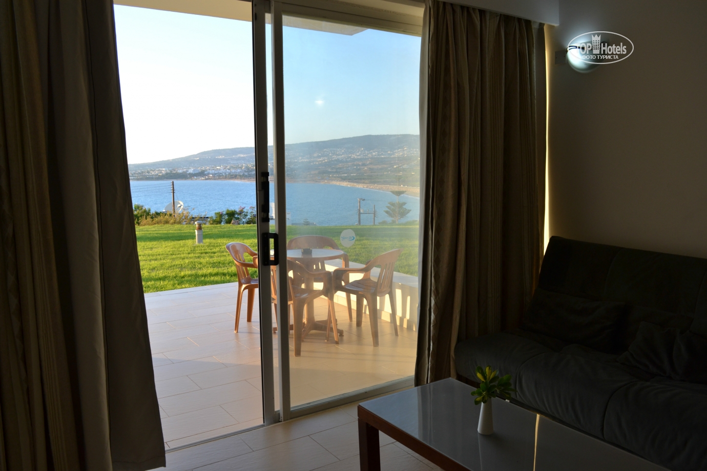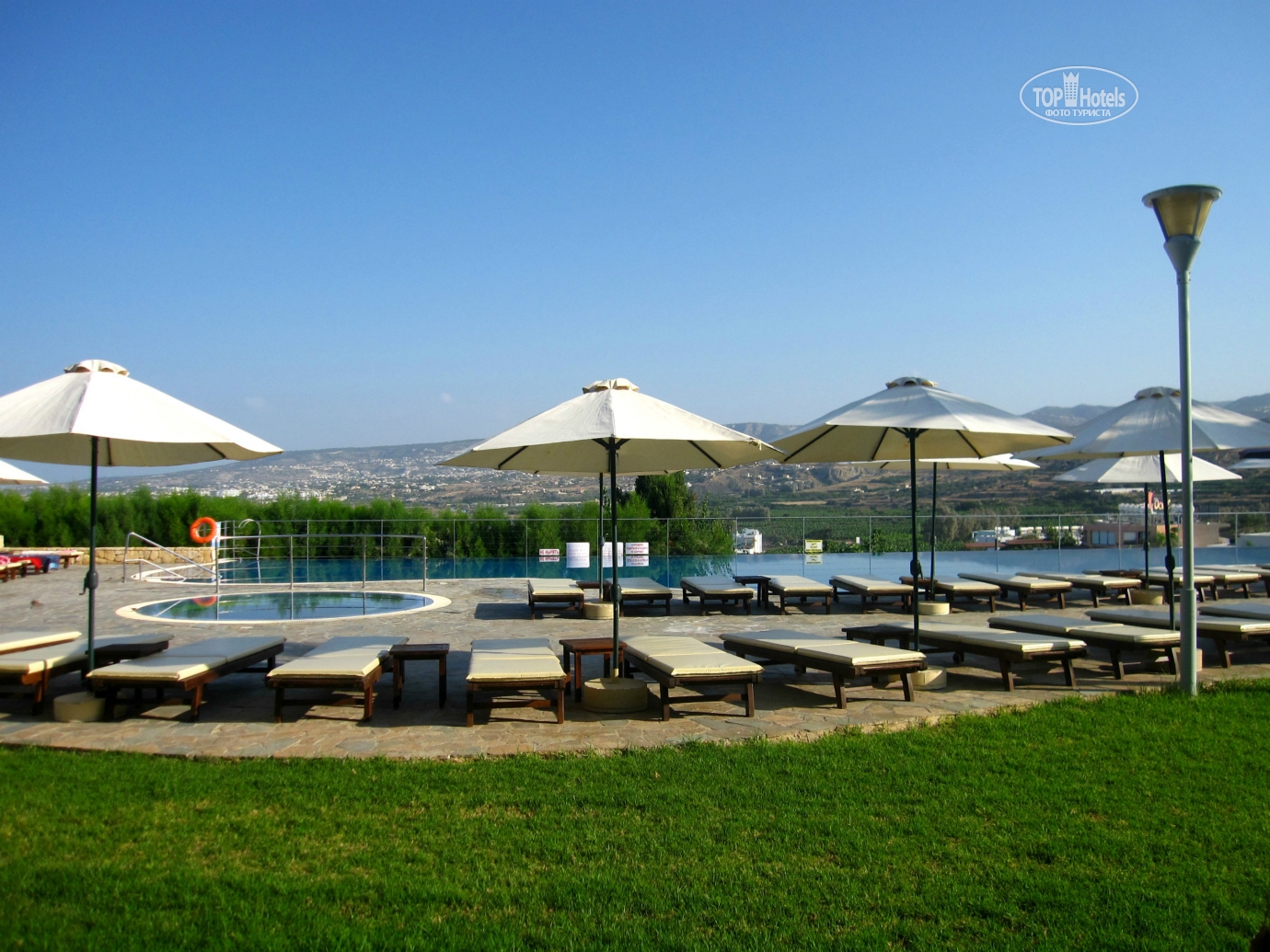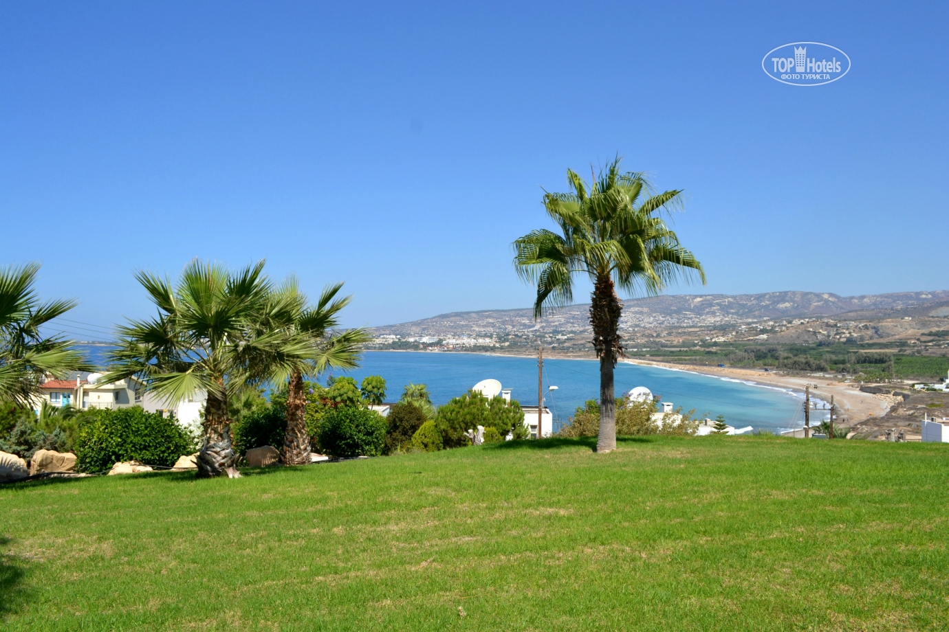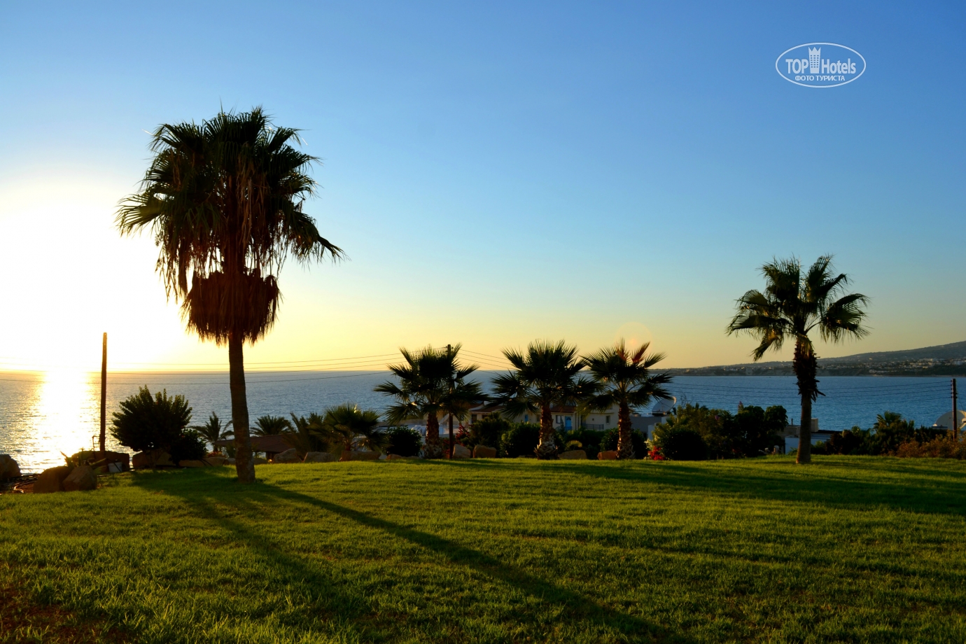 Наконец-то зарегистрировалась на tophotels и решила написать свой первый отзыв о нашем первом отдыхе за границей. На Кипре были в сентябре. Прекрасная погода, ласковое море, яркое солнце. Отель выбирали очень долго, и все таки остановились на Theo Sunset Bay Holiday Village 4*, который находится совсем недалеко от Пафоса и аэропорта. Сам отель: чудесный, красивая зеленая территория, аккуратные белые домики, панорамный бассейн с видом на средиземное море. Мы жили в номере с видом на море и зеленую лужайку, номер замечательный, просторный, чистый. Контингент: много отдыхающих, а вот наших сограждан не так уж и много, отель пользуется популярностью у иностранных туристов. Еда: мы не столь привередливы к еде, как многие, поэтому вся еда нас обычно очень устраивала, достаточно разнообразное меню, много всяких вкусностей, единственный минус - было ОЧЕНЬ мало хороших фруктов. Но нам сказали, что мы попали не в сезон. Возможно и так. При отеле есть магазинчик, там можно купить все самое необходимое, какие-нибудь продукты. Но нам всего хватало и без магазина (мы ездили по системе All inclusive). Пляж: его можно сказать нет. Минус этого отеля - до моря далековато. Очень каменистая местность, пляжа как такового нет. Есть небольшая песчаная полоска у соседнего отеля, так же есть галечный пляж справа от отеля, но до него идти 15 мин. пешком и там не особо чистая вода, большие волны и неудобный заход в море. Ближайший хороший пляж - Coral Beach, до него можно добраться на мимопроходящем автобусе, вроде 615. Вот там, конечно, ровный белый песочек и чистое спокойное море. Экскурсии: мы брали 3 экскурсии. 1.Экскурсия по Пафосу (включает в себя прогулку по достопримечательностям Пафоса, археологический музей под открытым небом, поездка в бухту Афродиты, заезжали на фабрику Рахат-Лукума, ездили в горы в Монастырь Святого Неофита-Затворника). Поездка была очень насыщенной, было очень жарко, но нам все очень понравилось. 2. Сафари на Джипах (это самая незабываемая экскурсия, мы познакомились с самым классным и веселым человеком на Кипре - Эвисом, который развлекал в течении всей поездки, шутил, пел...теперь мы вспоминаем его только с улыбками, просто очень хороший парень! на джипах мы ездили в горное ущелье Акамас, на залив Лара Бэй, где рождаются маленькие черепашки и в горы в купальню Афродиты - очень красивый водопад). Это самая классная экскурсия, советуем ее всем! 3. Аквапарк Фисури (очень интересный, большая зеленая территория, много горок). Просто хорошо провели там целый день! В целом отдых на Кипре запомнился нам на всю жизнь, отель Theo Sunset Bay Holiday Village 4* замечательный, всем советуем! Хорошего отдыха и настроения!!!