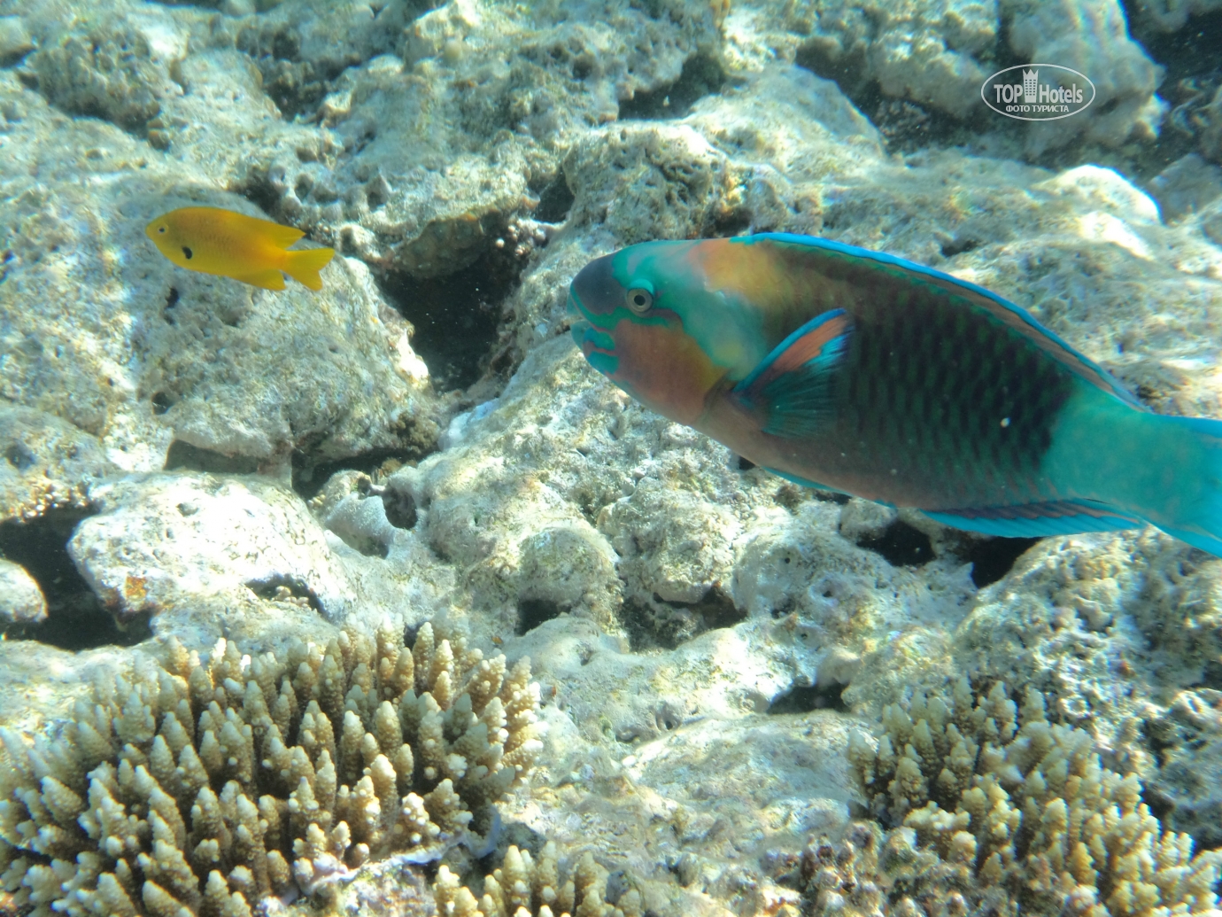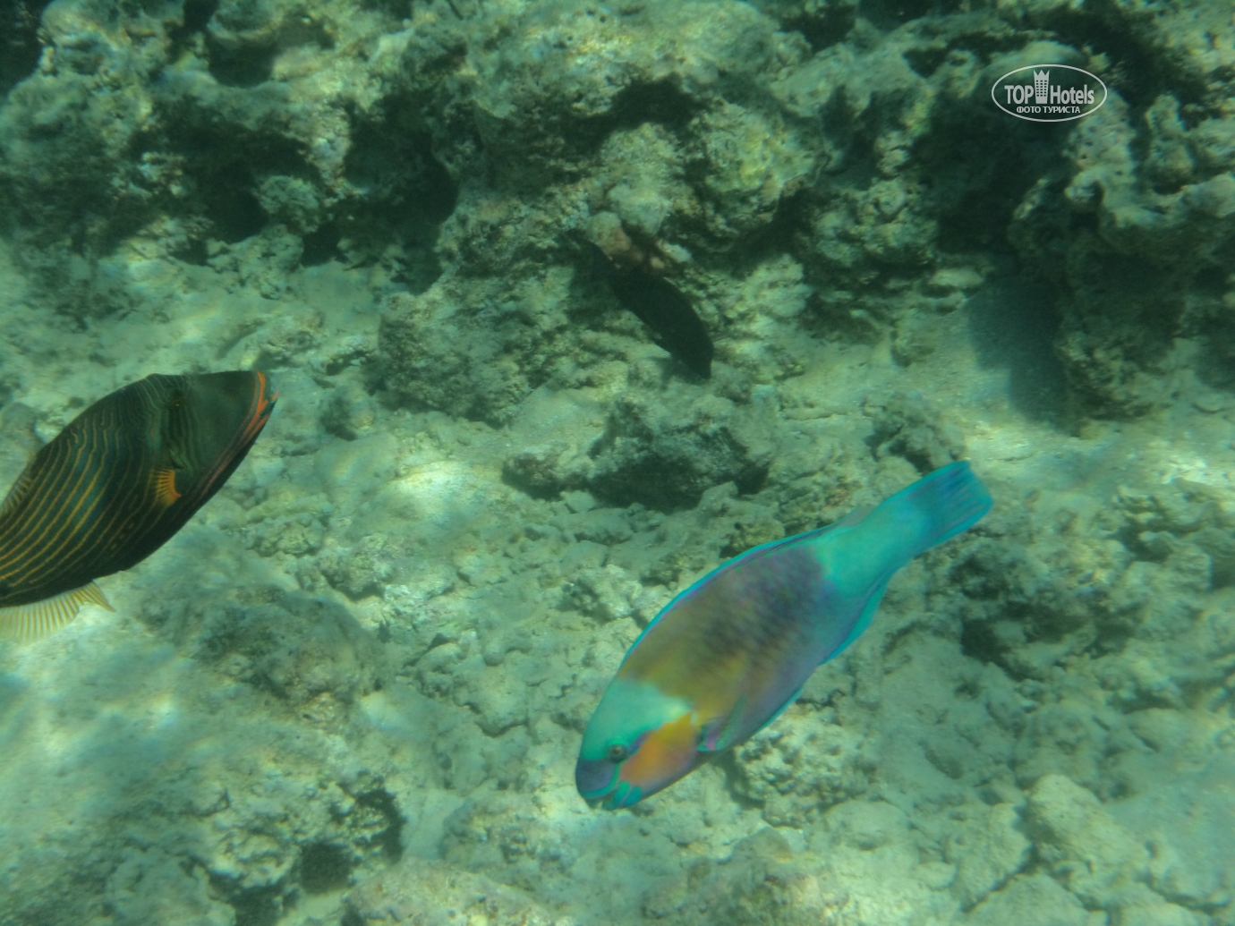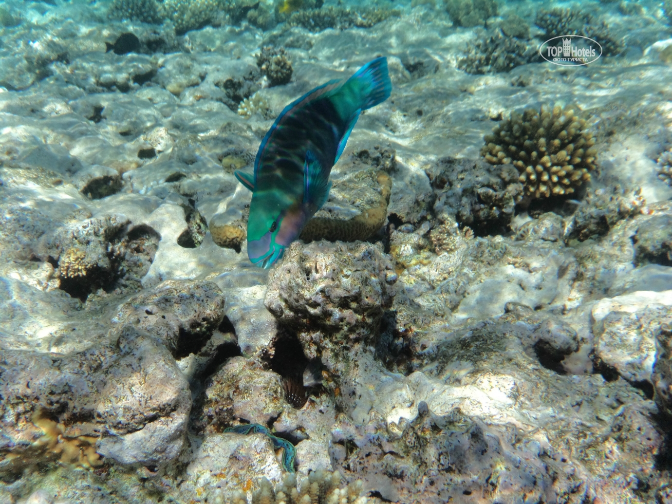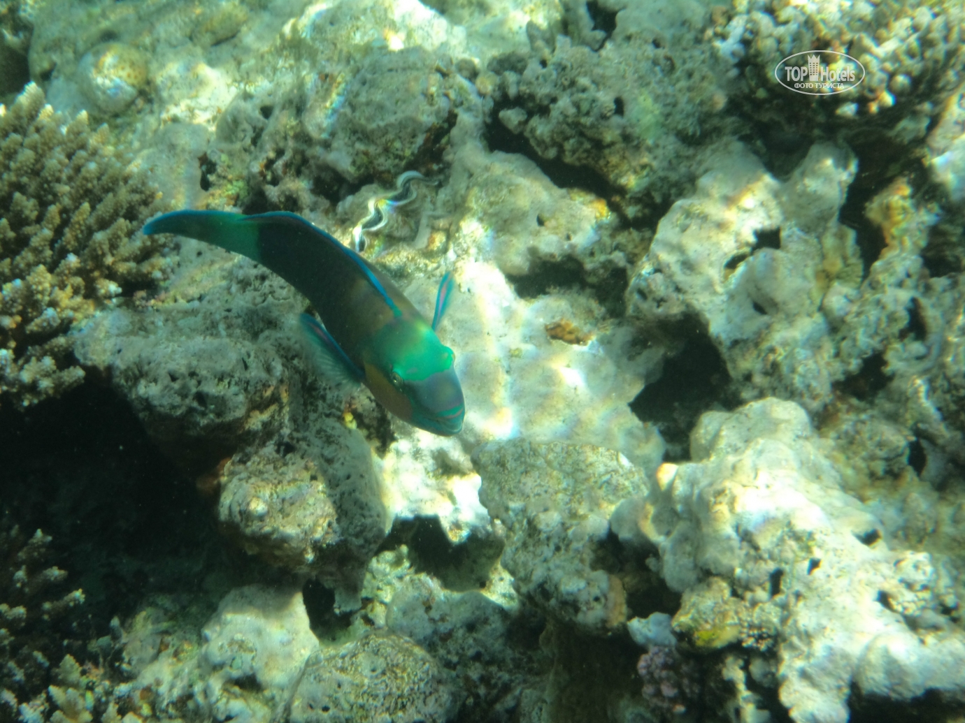 Итак, вот и мы провели свои несколько солнечных дней на берегу красного моря с 06 по 13 января 2014 года. Начну по порядку. Отпуск мы проводили вчетвером, я с супругом и его родители. Путевку приобретали у ТезТура. Летели мы авиакомпанией авиалинии Харькова, самолет боинг 737-800 из Донецка. Оба рейса (туда и обратно) по расписанию. По прилету сразу прошли на паспортный контроль, указав в миграционных картах «sinai only» и уже через 10 минут, получив заветные штампы в паспорте, сидели в автобусе, который отвез нас до отеля. В Hilton Sharks Bay мы прибыли в 18-30, заполнили на ресепшен анкеты и с ветерком на тук-туке поехали в наши номера. НОМЕРА нам достались на второй линии 4109 и 4111. Вид из номера на бассейн и во двор отеля. В одном номере были две кровати, в другом одна большая, в остальном номера не отличались: большой плазменный телевизор, но только 1 русскоязычный канал – ОРТ, в ванной комнате и ванна и душевая кабина, шампунь, кондиционер, шапочка, мыло, паста, а еще есть утюг, гладильная доска, чайник две чашки, чай, кофе, сахар, сливки, а также целых три телефонных аппарата (один даже в туалете, видимо, чтобы можно было общаться в уголке задумчивости:), в общем все прелести жизни. Кровати мягкие удобные, кондиционер работает вне зависимости от балконной двери. Убирают номера каждый день, все чистенько, крутят каждый раз новые фигурки. Насекомых в помещениях нет. Каждый день приносят полуторалитровую бутылку оды, если мало можно взять в любом баре. Уборщикам оставляли каждый день доллар, один раз шоколадку (главное, чтоб без алкоголя была). ТЕРРИТОРИЯ отеля вытянутая от моря вглубь, занимает 2-е линии, заселена в основном вторая. (Мне казалось, что на первой кто-то живет, около самого моря, но может мне и показалось). Ресепшены работают на обеих линиях. По территории курсирует автобус, от моря к первому решепшену, потом ко второму, потом мимо всех номеров второй линии и снова на море. Остановка у пляжа каждые 30 минут. Сама территория зеленая, но цветов было мало (зима все-таки)). Деревья аккуратно подстрижены, многие имеют форму разных фигур. На каждой линии есть бассейны, на второй – зимой подогревается. Бассейн на первой линии с 10 января на 7 недель закрыли на реконструкцию. Отель расположен близко к аэропорту, видно и слышно как взлетают и садятся самолеты, но звук не беспокоил. ЗА ТЕРРИТОРИЕЙ (со второй линии направо, с первой - налево) есть ряд магазинов, где можно купить сувениры, фрукты (по сезону), маски-ласты, есть бюро экскурсий, мини супермаркет:), сумки-чемоданы, одежка разная местная и европейская, а далее пешеходная улица Сохо (для желающих, там есть дюти-фри, но купить там можно только при наличии паспорта и в течение 48 часов по прибытии). У входа на Сохо всегда 2-3 верблюда, на них можно покататься, но дикий запах отбил все желание кататься, хотя гуаву животинки кушали на «ура», с ними можно фотографироваться. На самой Сохо, есть рестораны, детская зона, множество магазинов. В новый год улица была потрясающей украшена и сверкала как елка. В середине – поющий фонтан, включающийся каждый час. Зрелище очень красивое. Даже под русские песни исполняет свои мокрые танцы. Также на улице можно взять такси. Везде нужно торговаться, а то цену сильно завышают. Мы хотели съездить в старый город, начальная цена такси была 140 фунтов, а сторговались до 70, но все равно не поехали))) ПЕРСОН