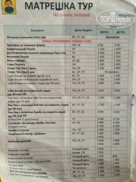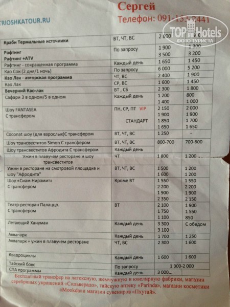 Здравствуйте!!! В своем отзыве я постараюсь рассказать информацию, которой не нашла в остальных отзывах.Это был наш первый визит в Тайланд. Отдыхали с 3.10.13 по 13.10.13. Отель Karon Phunaka Resort & Spa. Начну с самого начала. Летети от турфирмы Sunmar и Transaero.Перелет был прямым рейсом из Москвы на Пхукет. По прилету нас быстро встретили и мы отправились в отель. Отель СУПЕР!!! На ресепшн нас встретили с напитками и соками, быстро разместили. Отель находится на возвышенности и состоит из нескольких уровней. 1 уровень - ресепшн и ресторан 2 уровень - жилой + бассейн 3,4 уровни - жилые Мы жили на 4 уровне. Чтобы добраться до нужного уровня, ходит лифт (см.фото) Номера убирают каждый день добросовестно и качественно. Территория отеля обрабатывается от насекомых, но маленьких ящериц полно ночью) От отеля до моря, честно сказать,далеко. В определенные часы из отеля до пляжа ходит машина бесплатно. Да и прогуляться пешком не напряжно. А если еще взять скутер в аренду, то вообще красота. Кстати о скутерах. Мы долго думали взять или нет, т.к.начитались отзывов об обманах и больших выплатах за небольшие царапины. Но все равно взяли и не пожалели. Аренда байка стоит 200 бат в сутки. Рекомендую брать у женщины, прям возле отеля. Не бойтесь, она не обманет, мы проверяли:) но будьте аккуратны, т.к тайцы беспределят, ездят как хотят+левостороннее движение. Не гоняйте пока не привыкните к мопеду. Пляж. Пляж Карон мне понравился больше, чем маленькая Ката и грязный Патонг. Волны в наш отпуск были большие и висел красный флаг, но это не помешало нам искупаться в море) Заходить дальше, чем по пояс нельзя, иначе может утянуть подводное течение.Будьте аккуратны, не переоцените свои возможности. шезлонги на пляже платные 100 бат целый день. Причем очень удобно, что можно уходить, приходить 100 раз в день, занимать лежак, т.к вы его оплатили ранее. Покупки. На Пхукете цены на вещи и в ресторанах такие же как в Москве. Мы объездили все торговые центры и не нашли ничего дешевого, кроме как в Пхукет Тауне. Там ценник ниже. Экскурсии. У гида ничего не берите, дороже будет. Мы ездили от Матрешка Тур на острова Пхи пхи и морскую рыбалку. На остальные погода не позволила. Выкладываю фото с ценами на экскурсии в Матрешка тур. Их офис находится по пути на пляж, возле храма. Вот как выходите на главную дорогу со стороны отеля, направо на пляж, вам надо чуть прямо пройти и справа через дорогу увидите:)Экскурсия на пхи пхи очень понравилась, но сразу предупреждаю, не садитесь вперед скоростной лодки, отобьете все что можно.Обязательно намажьтесь солнцезащитным кремом и возьмите полотенца или что нибудь, чтоб накрыть тело. Весь день на солнце, обгорите:( как я:( Морская рыбалка ужас, всех укачало,тошнило, рыбы поймали мало и приготовили ее ужасно.Не советую. Что касается обмена денег, то НЕ БЕРИТЕ С СОБОЙ РУБЛИ. Ужасно не выгодно менять рубли, но возможно. Лучше всего не париться и снять с карточки в банкомате или 50-100 долларовыми купюрами. Массаж. Мы ходили на массаж по пути на пляж, есть незаметное местечко, но там делают массаж с большой самоотдачей и на совесть, что не сказать про другие салоны на главной улице, где только вид сделают, что это массаж. Советую найти это место и сделать курс массажа 10 дней, не пожалеете. Вот фото салона где делали мы. Напротив него вот такие деревья искуственные И расскажу про морепродукты. Во вс